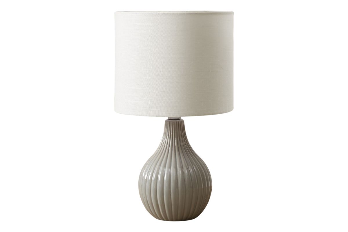 - This 17"h table lamp features a chic, lustrous grey ceramic base in a tear drop shape with a textured ribbed design, perfectly complemented with an ivory fabric shade, adding a fashionable touch to your living room, bedroom, or office."