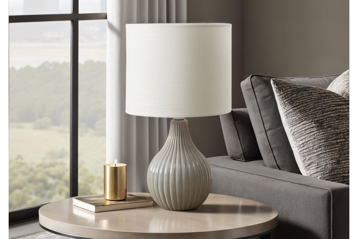 Step into a world of stylish sophistication with this stunning, 17"h glossy grey ceramic table lamp. Perfectly designed to accentuate any decor, this contemporary masterpiece effortlessly blends function and flair. Crafted from a lustrous ceramic base with a textured finish base that has a ribbed design that curves with the tear drop shape, this lamp is not just a source of lighting, but a statement piece that radiates ambiance throughout your home. Adorned with an ivory fabric shade, this lamp brings a warm glow to your office, living room, or bedroom. The simple on/off turn knob switch that holds up to a 60W bulb (not included) brightens your favorite end or side table, or nightstand. Enjoy peace of mind with our 2 year limited warranty against manufacturer defects, ensuring a highly reliable lamp made with quality materials. This decorative table lamp will illuminate and instantly transform a room to a modern elegance.