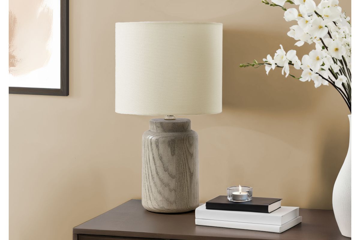 Brighten up your living room, bedroom, or office with this stylish 17"h table lamp! Crafted with a durable taupe resin base that has the look of natural wood, this decorative lighting accent will be a standout from contemporary and modern to transitional home styles. Featuring a sophisticated ivory fabric shade, this lamp adds a touch of elegance to your nightstand, end or side table, making it the perfect companion for those cozy evenings. Compatible with a 60W bulb (not included), this table lamp is designed with an easy-to-use on/off turn knob switch to effortlessly create the perfect ambiance in a room. For your comfort, a 2 year limited warranty against manufacturer defects is included for this quality made item. Simply place the ivory shade over the smooth resin base and set it on a table for a fashionable and trendy upgrade to your home decor.