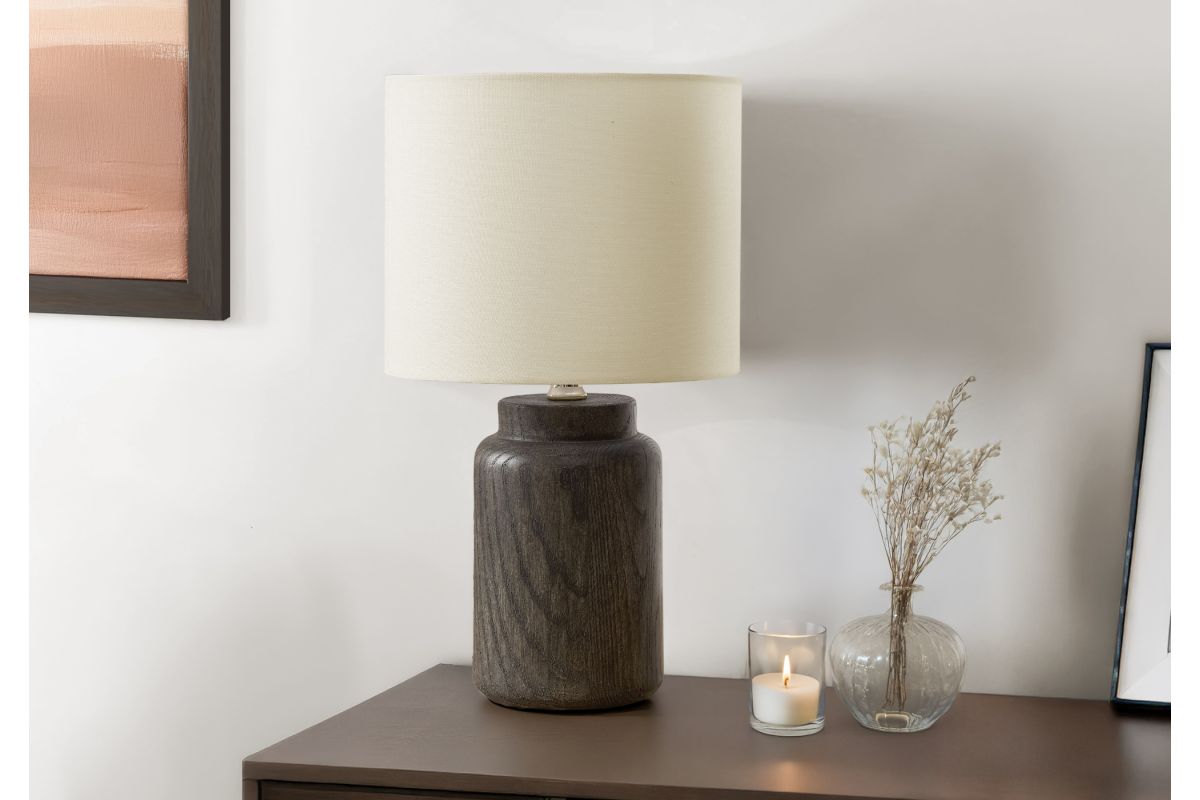 Brighten up your living room, bedroom, or office with this stylish 17"h table lamp! Crafted with a durable brown resin base that has the look of natural wood, this decorative lighting accent will be a standout from contemporary and modern to transitional home styles. Featuring a sophisticated ivory fabric shade, this lamp adds a touch of elegance to your nightstand, end or side table, making it the perfect companion for those cozy evenings. Compatible with a 60W bulb (not included), this table lamp is designed with an easy-to-use on/off turn knob switch to effortlessly create the perfect ambiance in a room. For your comfort, a 2 year limited warranty against manufacturer defects is included for this quality made item. Simply place the ivory shade over the smooth resin base and set it on a table for a fashionable and trendy upgrade to your home decor.