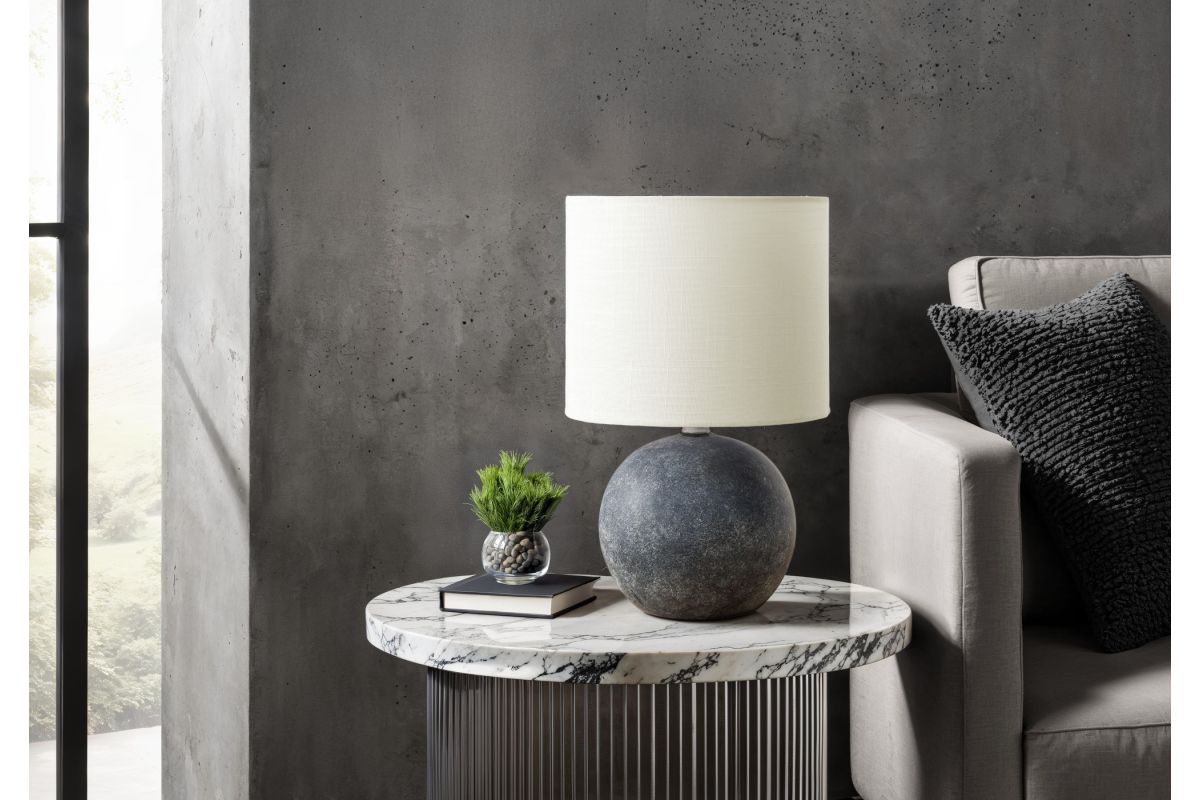 Illuminate your space with the ultimate blend of style and functionality with this 16"h table lamp in a sophisticated grey concrete finish topped with an ivory fabric shade. This chic accent piece is designed to elevate the ambiance in a modern living room, bedroom, or office. Crafted from durable concrete with a classic drum shade emitting a soft glow to brighten a space, this lamp makes the ideal companion for any end or side table, nightstand or bedside. This stylish table lamp is equipped with an easy on/off turn knob switch to operate up to a 60W bulb (not included), for a practical and decorative accent. Made with high quality and reliable materials, enjoy a 2 year limited warranty against manufacturer defects for a practical and trendy lighting source.