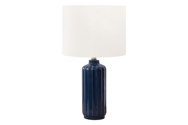 Beautify your space with this fashionable and stylish 23"h glossy blue ceramic table lamp. Composed of high-quality ceramic material in a chic ribbed design, this decorative lamp is complimented with a sophisticated ivory fabric shade that diffuses the light beautifully, generating a warm ambiance that brightens your end or side table, nightstand, or bedside table. Equipped with an easy on/off turn knob switch for effortless control, this lamp operates with a standard 100W bulb (not included) to create a welcoming atmosphere. Enjoy peace of mind with our 2 year limited warranty against manufacturer defects, ensuring a reliable and well-made lighting accent. Well suited to fit all decor styles, illuminate your living room, bedroom, or office with this versatile and on-trend table lamp with a columnar shape base, adding dimension to a room.