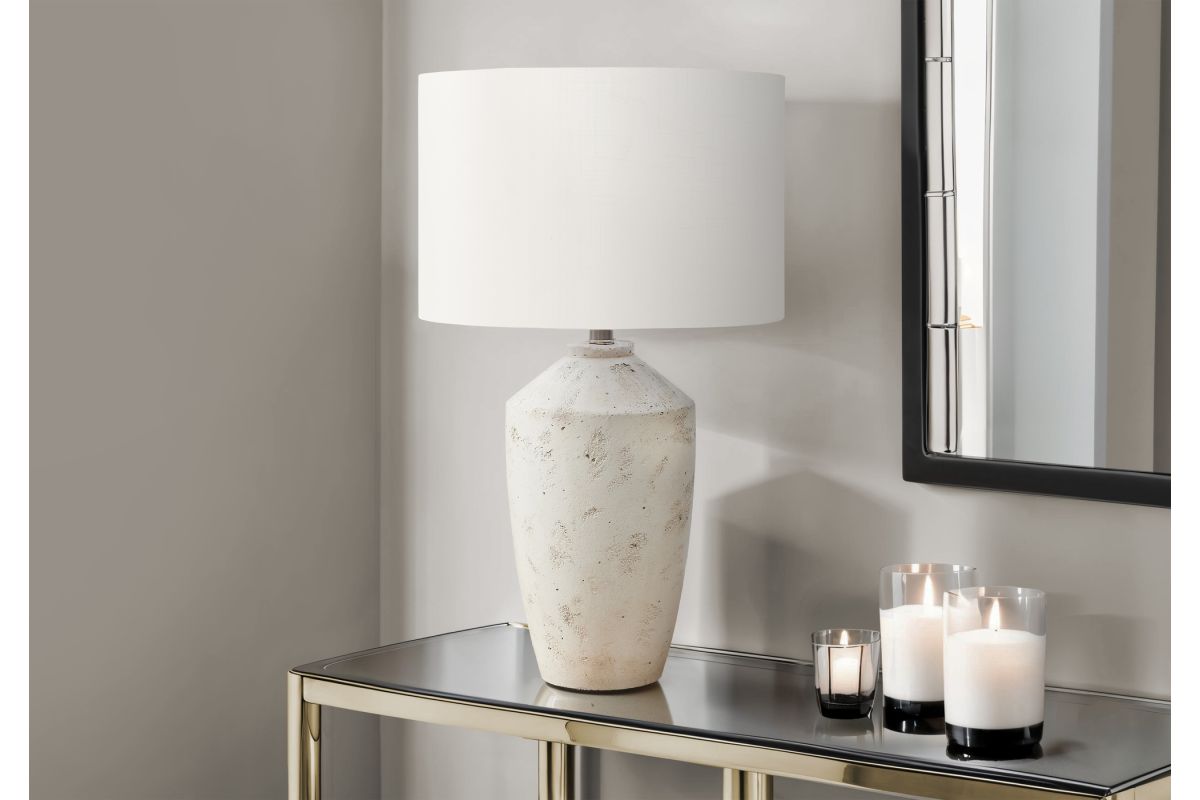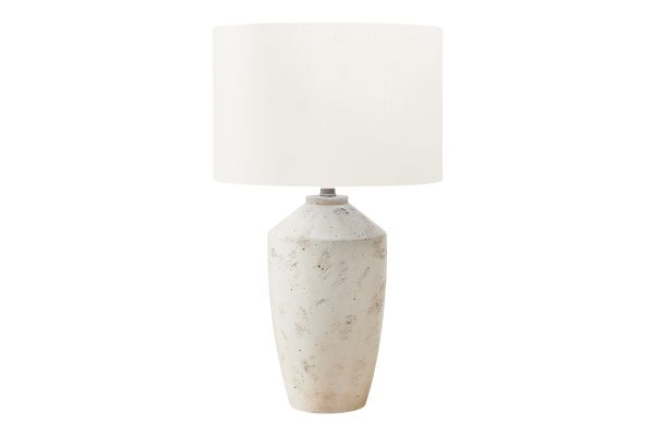 Update your living room, bedroom, or office into a beacon of modernity and elegance with this 25"h table lamp. Designed with a chic ivory concrete base in an aged finish, this lamp pairs beautifully with the modern ivory fabric shade that softly diffuses the light, creating an inviting ambiance that is both decorative and functional. Place this contemporary accent piece on any end or side table, a console, or on a nightstand to effortlessly illuminate a room. This decorative lamp has a convenient 3-way switch compatible with a 3-way bulb up to 100W (not included), allowing you to adjust the lighting to whatever mood you desire, whether for reading, relaxing, or entertaining. With a 2 year limited warranty against manufacturer defects, rest assured this quality made and reliable table lamp will be part of your decor for many years. Brighten your home with this new favorite lighting solution that combines a textured concrete base with a contemporary drum ivory shade.