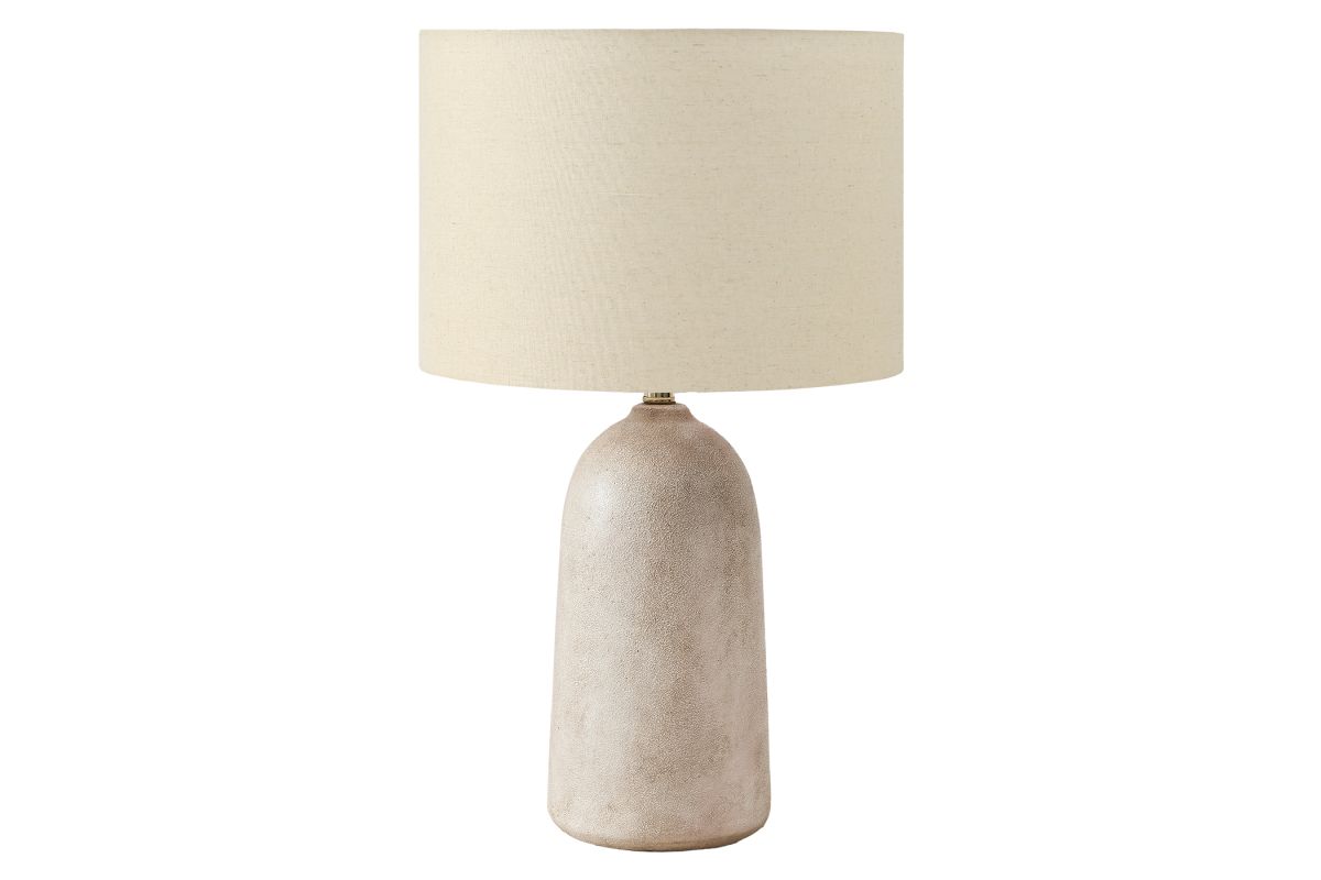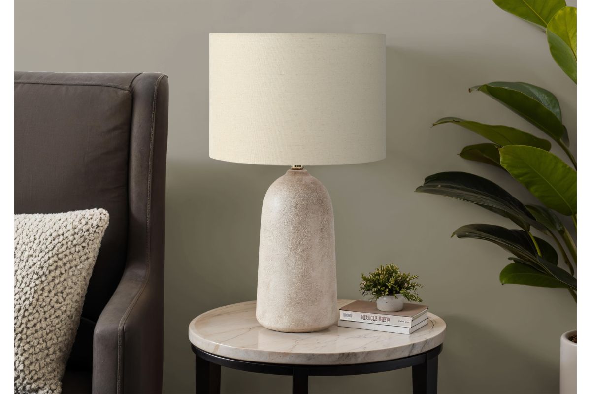 "A perfect blend of contemporary elegance and modern functionality, this chic 27"h beige ceramic table lamp will elevate your home interior to new heights. Crafted with a columnar shaped, textured ceramic base and topped with a linen-blend beige fabric shade, this decorative lamp is designed to seamlessly illuminate your living room, bedroom, or office. Featuring a versatile 3-way switch compatible with a 3-way bulb up to 100W (not included), this accent piece will create the right ambiance whether placed on your end or side table, credenza, or nightstand. Backed by a 2 year limited warranty, you can trust in the quality and longevity of this exciting lighting solution. Transform your space into a cozy retreat and brighten your world with this simple yet fashionable and trendy ceramic table lamp with a contemporary drum shade, and make a bold statement that reflects your unique style!"