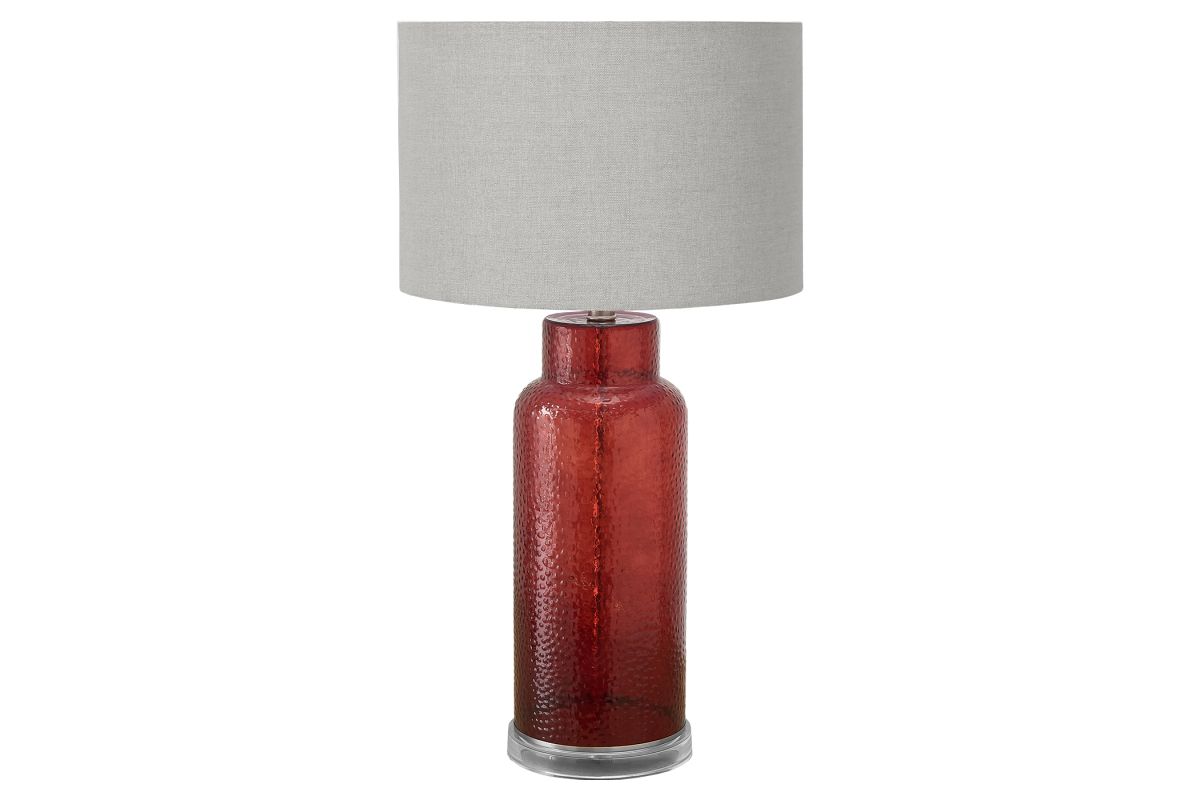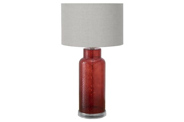 - This contemporary, 28"h table lamp features a textured, translucent red glass body on a clear acrylic base and topped with a sophisticated grey fabric shade