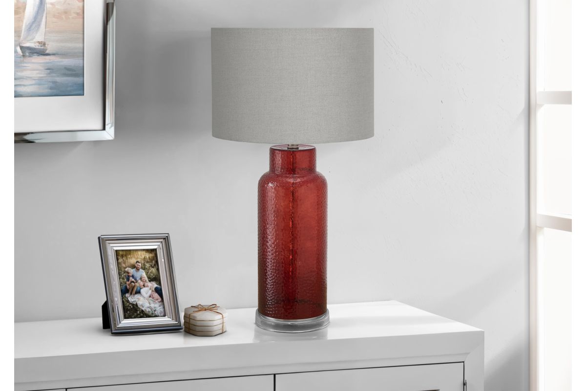 Crafted with a textured red glass body and supported by a clear acrylic base, add this chic, 28"h decorative table lamp in your living room, bedroom, or home office for an instant transformation. This contemporary lighting piece combines functionality with fashion, making it the perfect accent for any end or side table, console, or nightstand. The stunning glass base in a sleek cylinder shape is more than just lighting but a statement of style. The sophisticated grey fabric shade adds a modern touch, creating a warm ambiance that brightens up your space without overwhelming it. The convenient on/off turn knob switch works with a standard 100W bulb (not included), making it practical for daily use, whether enjoying a quiet evening reading by the light or hosting friends in your living room. Worried about quality? Our 2 year limited warranty against manufacturer defects ensures that you receive a product that not only looks good but is built to last. Illuminate your decor with this stylish, fashionable and trendy lighting option that speaks to your modern sensibilities.