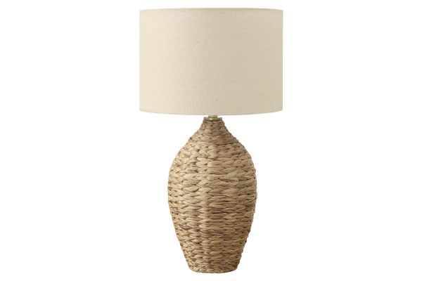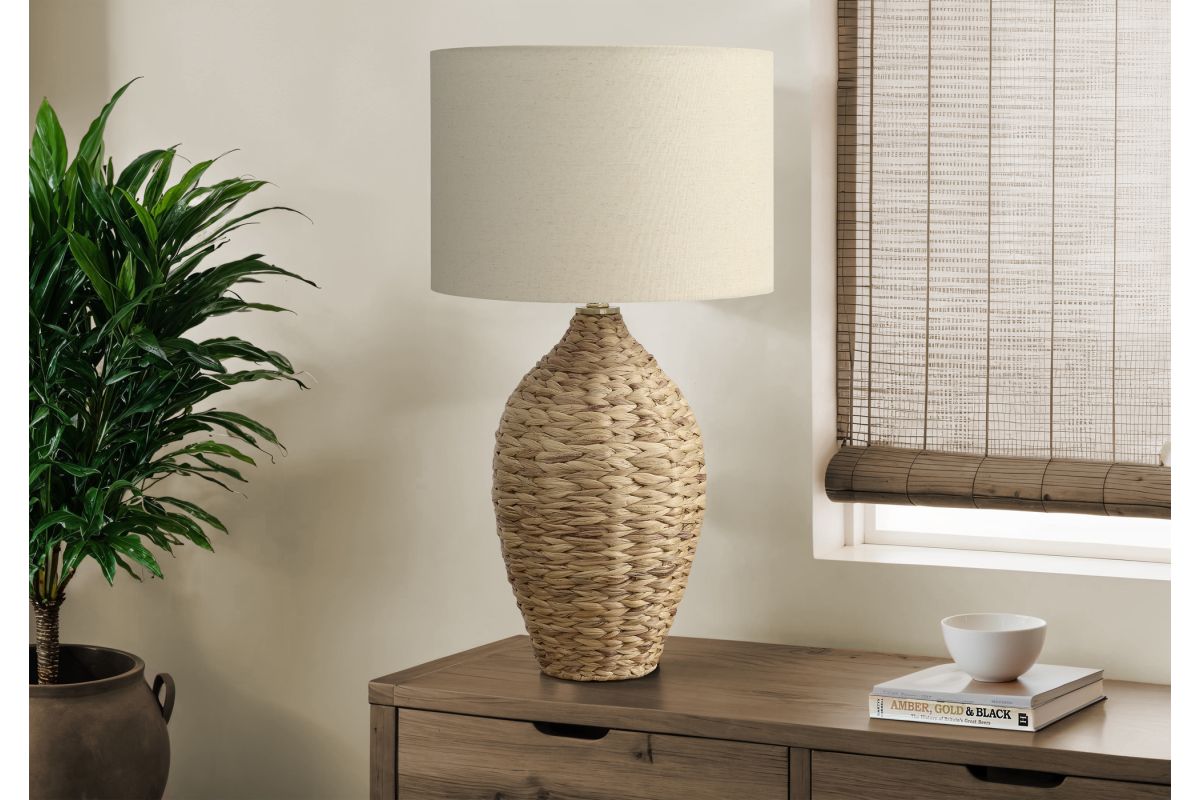 "Renew your decor with this stunning 30"h table lamp that perfectly blends natural beauty with contemporary style. The modern, linen-blend beige shade pairs beautifully with the vase shaped, textured finish base crafted from exquisite natural rattan in a woven design, adding depth and character to your living room, bedroom, or home office. This decorative accent lamp is not just about aesthetics, but it also brings functionality into the mix with its convenient 3-way switch that houses a 3-way bulb up to 100W (not included), allowing you to effortlessly adjust the lighting and create the right ambiance. The soft, warm glow illuminates an end or side table, adds a casual fashionable touch on a nightstand or practical lighting on a console table. Backed by a 2 year limited warranty against manufacturer defects, you can relax knowing this stylish lighting accent is built to last. Ideal for transitional styles, brighten your space and embrace the art of fashionable lighting with this eye-catching addition to your home design."
