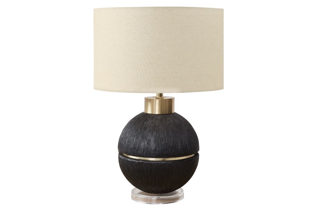 Make your home into a haven of style with our 26"h table lamp, a striking fusion of contemporary design and modern flair. Crafted with a unique, textured finish base in a stunning black resin and accented in gold around the globe shaped body, this lamp is not just a source of lighting but an eye-catching decorative accent that will brighten any room. This lamp sits atop a clear acrylic base and finished off with a chic beige fabric shade, making it a perfect fit for your living room, bedroom, or office. Whether setting the mood for a cozy evening or need focused light for your work, its convenient 3-way switch allows you to adjust the ambiance with the use of a 100W bulb (3-way bulb not included) to suit your lighting needs. Place this stylish accent lamp on an end or side table or use it as a bedside lamp on your nightstand and let its glow create an inviting atmosphere. Plus, enjoy peace of mind with our 2 year limited warranty against manufacturer defects, ensuring this lamp will light your way for years to come. Illuminate your space and make a statement with this fashionable and trendy brown resin table lamp with a beige shade where function meets fabulousness in perfect harmony.
