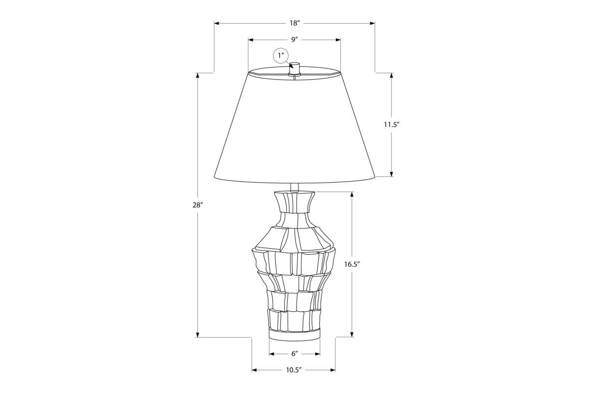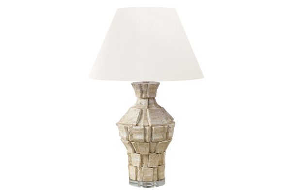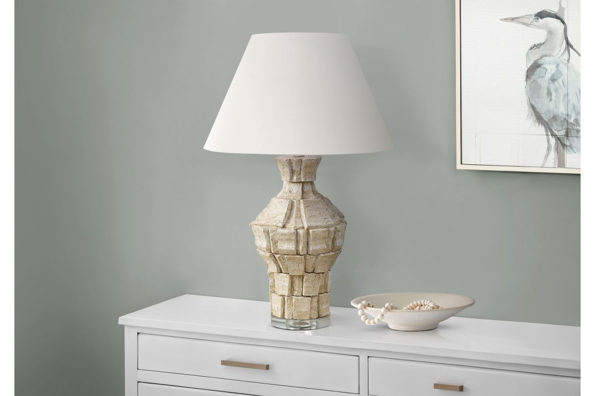 Bring a fresh spin to your modern decor with the introduction of this stunning 28"h table lamp in beige resin, sitting on a clear acrylic base and topped with a chic ivory fabric shade. This eye-catching accent piece with ancient inspiration in contemporary form brightens any room, whether placed on an end or side table, console, or nightstand. The a textured finish base imitates pieces of stone tiles, adding a touch of architectural elegance whether set in your living room, bedroom, or home office. This lighting accent features a convenient 3-way switch that holds up to a 100W standard bulb (3-way bulb not included), so you can effortlessly adjust the brightness in a space and create the right ambiance. Crafted using durable materials, this decorative lamp not only exudes a fashionable and trendy vibe but is also built to last with a 2 year limited warranty included against manufacturer defects. Why settle for ordinary when you can illuminate your interior with this extraordinary lamp that combines art with function!