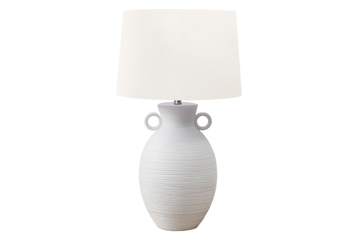 - Illuminate your space with this chic 30"h table lamp featuring a stylish white ceramic base in a fine ribbed, textured finish accented with round handles on each side, and a contemporary ivory fabric shade, perfect for creating an inviting ambiance in a transitional style living room, bedroom, or home office.
