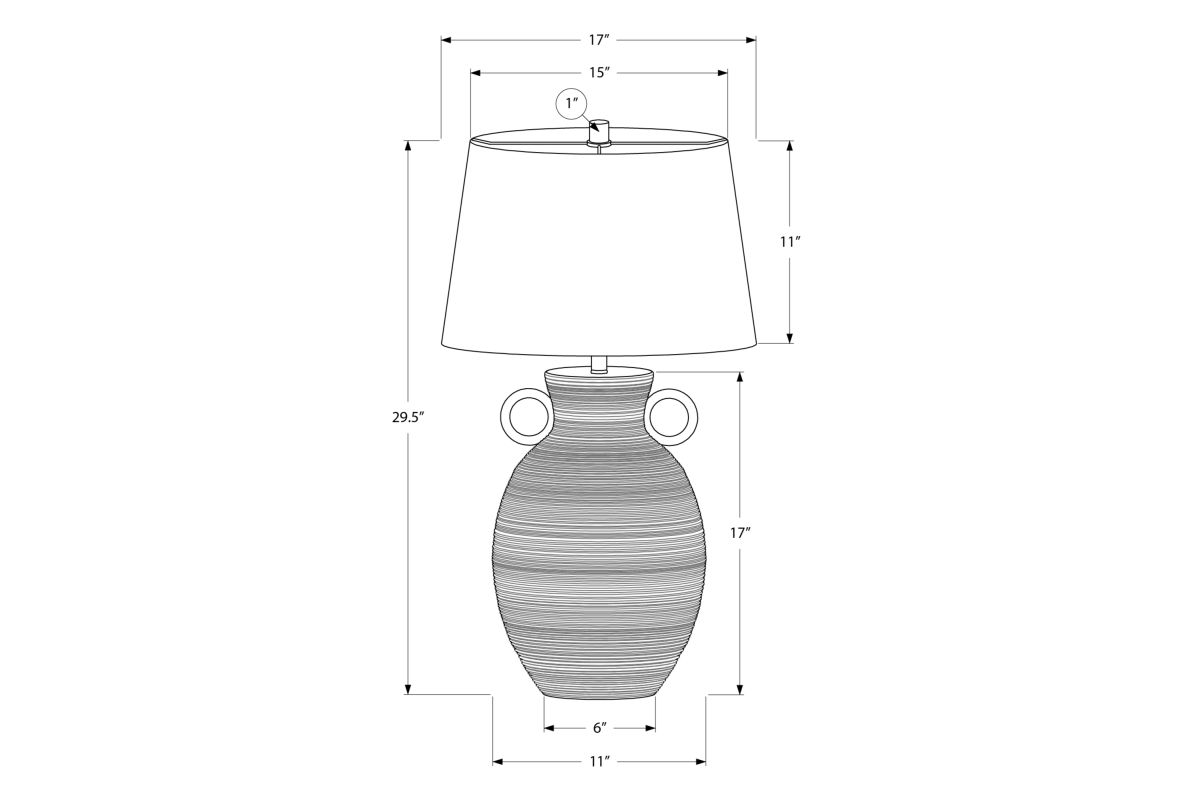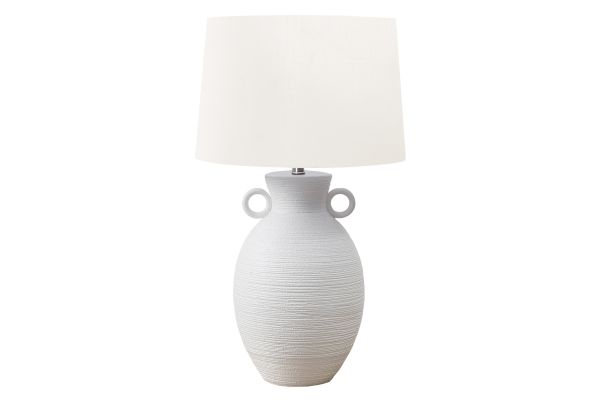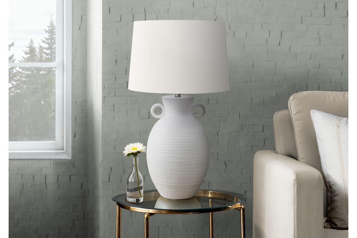 This eye-catching, 30"h table lamp is the epitome of fashion and elegance that will bring transitional decors to new heights! Featuring a white ceramic base with a fine, ribbed texture, accented with circular handles on either side of the vase shape design, and topped with a contemporary ivory fabric shade to transform your living room, bedroom, or office into a stylish sanctuary. Perfect for accenting any end or side table, a console, or nightstand this lamp not only serves as a source of lighting but also as a statement piece for fashion-forward customers looking to elevate their decor. The 3-way switch allows you to easily adjust the ambiance when paired with a 3-way bulb up to 100W (bulb not included), whether to brighten your space for a lively gathering or create a cozy atmosphere for a quiet evening. Rest easy with our 2 year limited warranty against manufacturer defects, ensuring your beautiful decorative lamp remains a long-lasting addition to your home. Stay fashionable and trendy with this versatile lighting option that seamlessly transitions from modern to transitional decor styles.