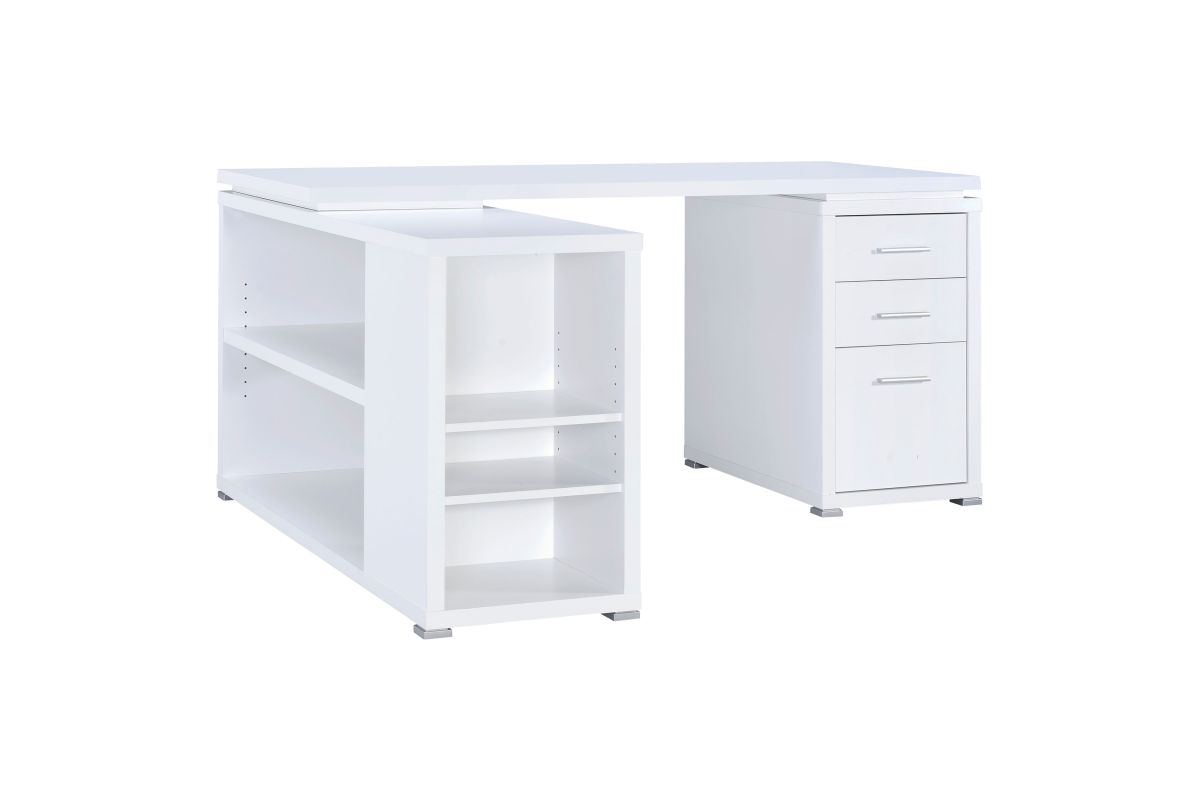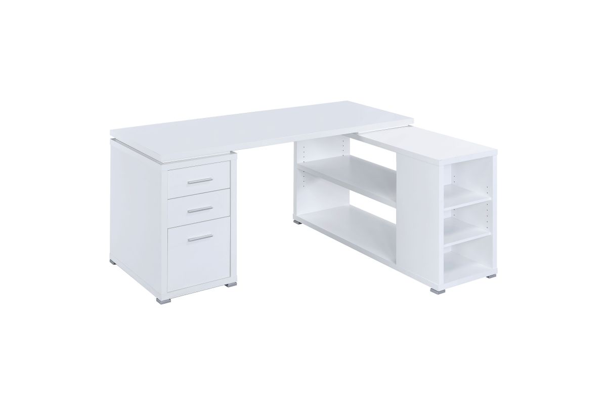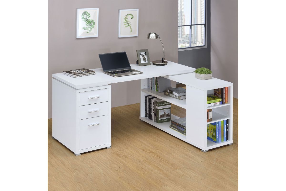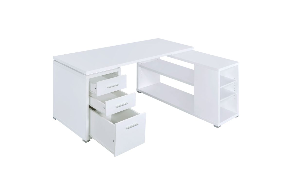 Bring organization and productivity into your workspace with this versatile L-shape office desk. Designed with an articulating return, it offers generous surface space for computers, books, and projects while keeping everything within reach. Two drawers and a built-in file cabinet provide secure storage for documents and supplies, while open shelving adds flexible display options. Crafted with engineered wood and laminate veneer, this sturdy desk blends durability with functional style for the modern office.