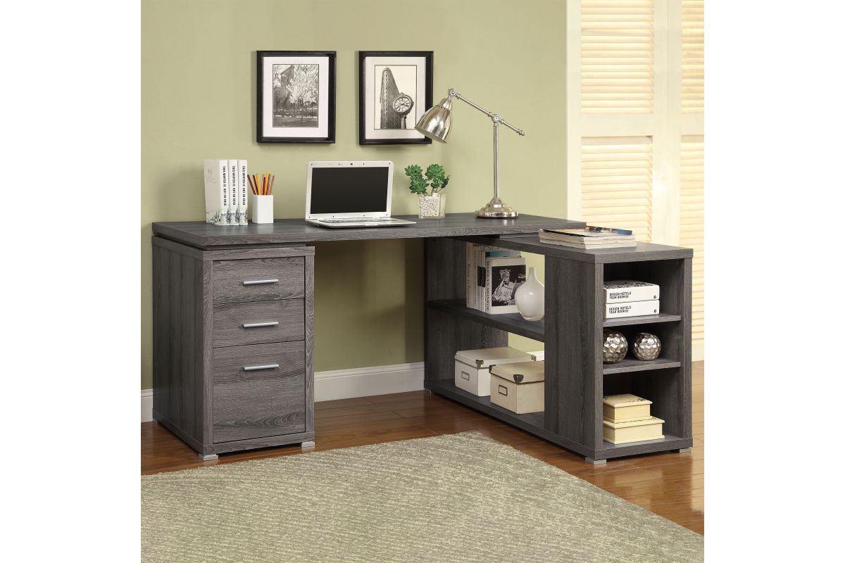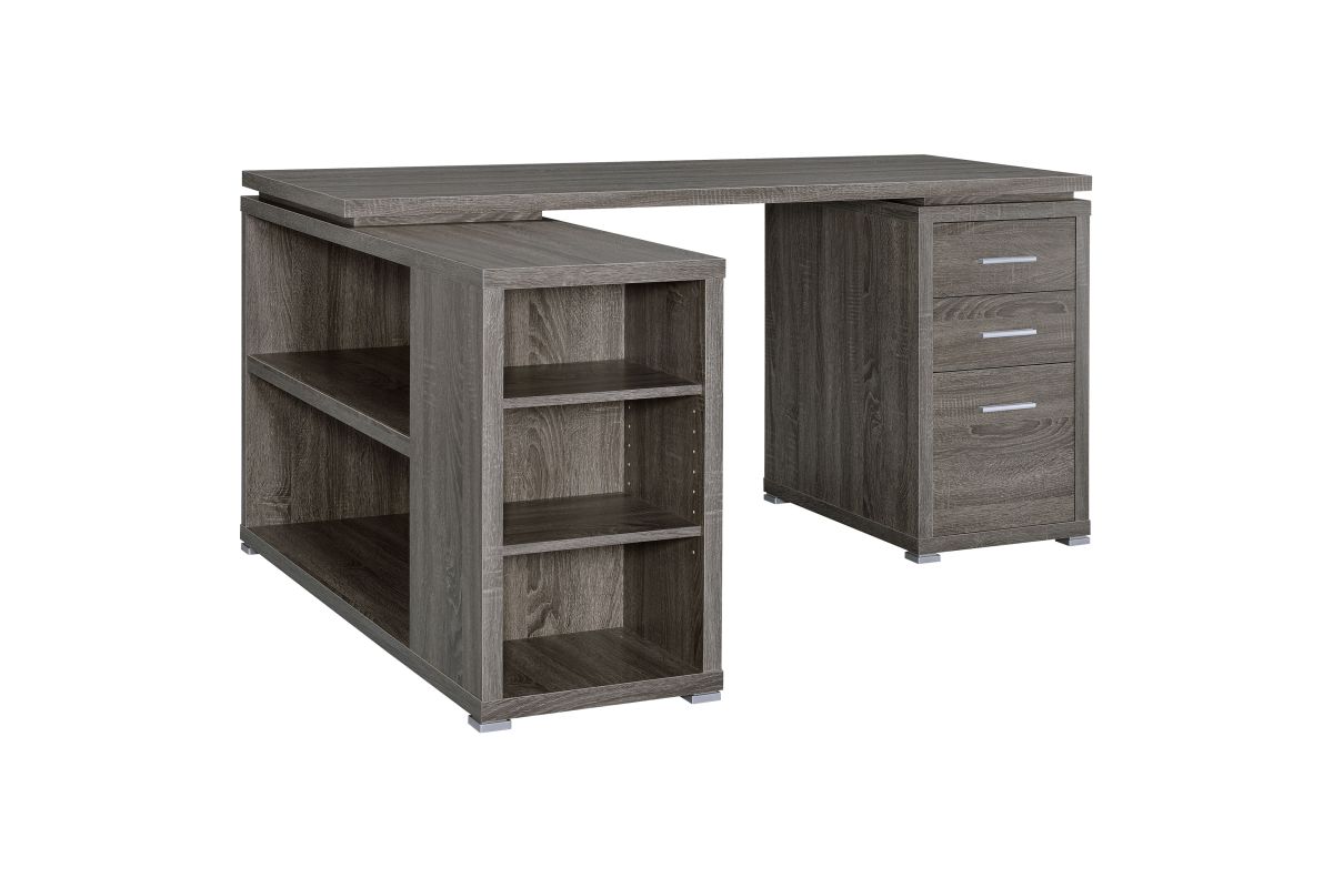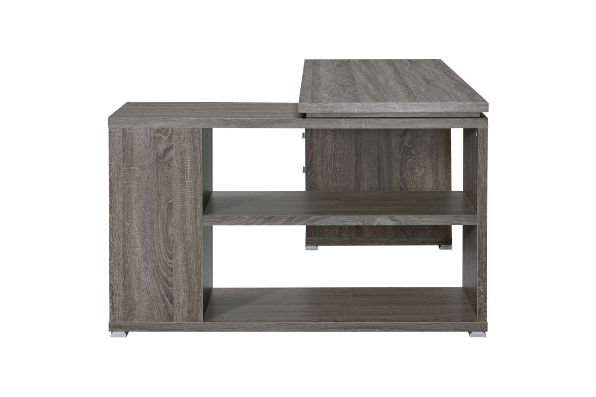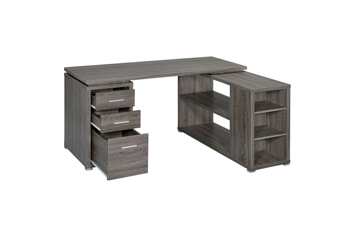 Bring organization and productivity into your workspace with this versatile L-shape office desk. Designed with an articulating return, it offers generous surface space for computers, books, and projects while keeping everything within reach. Two drawers and a built-in file cabinet provide secure storage for documents and supplies, while open shelving adds flexible display options. Crafted with engineered wood and laminate veneer, this sturdy desk blends durability with functional style for the modern office.