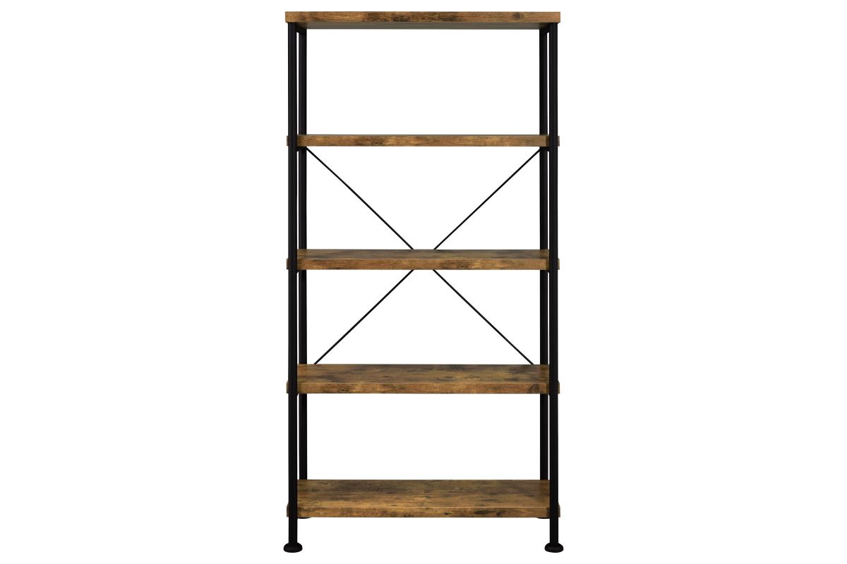 - Four-shelf bookcase with rustic nutmeg finish and open industrial styling