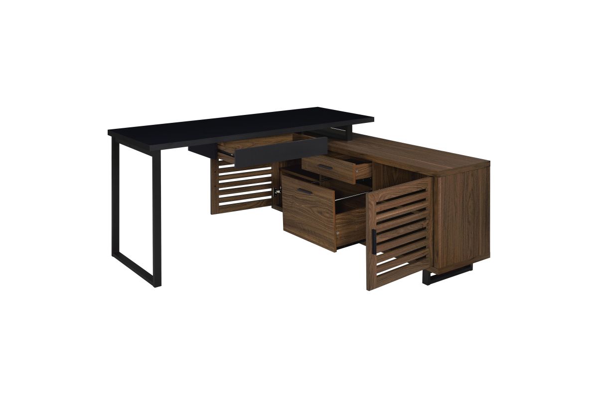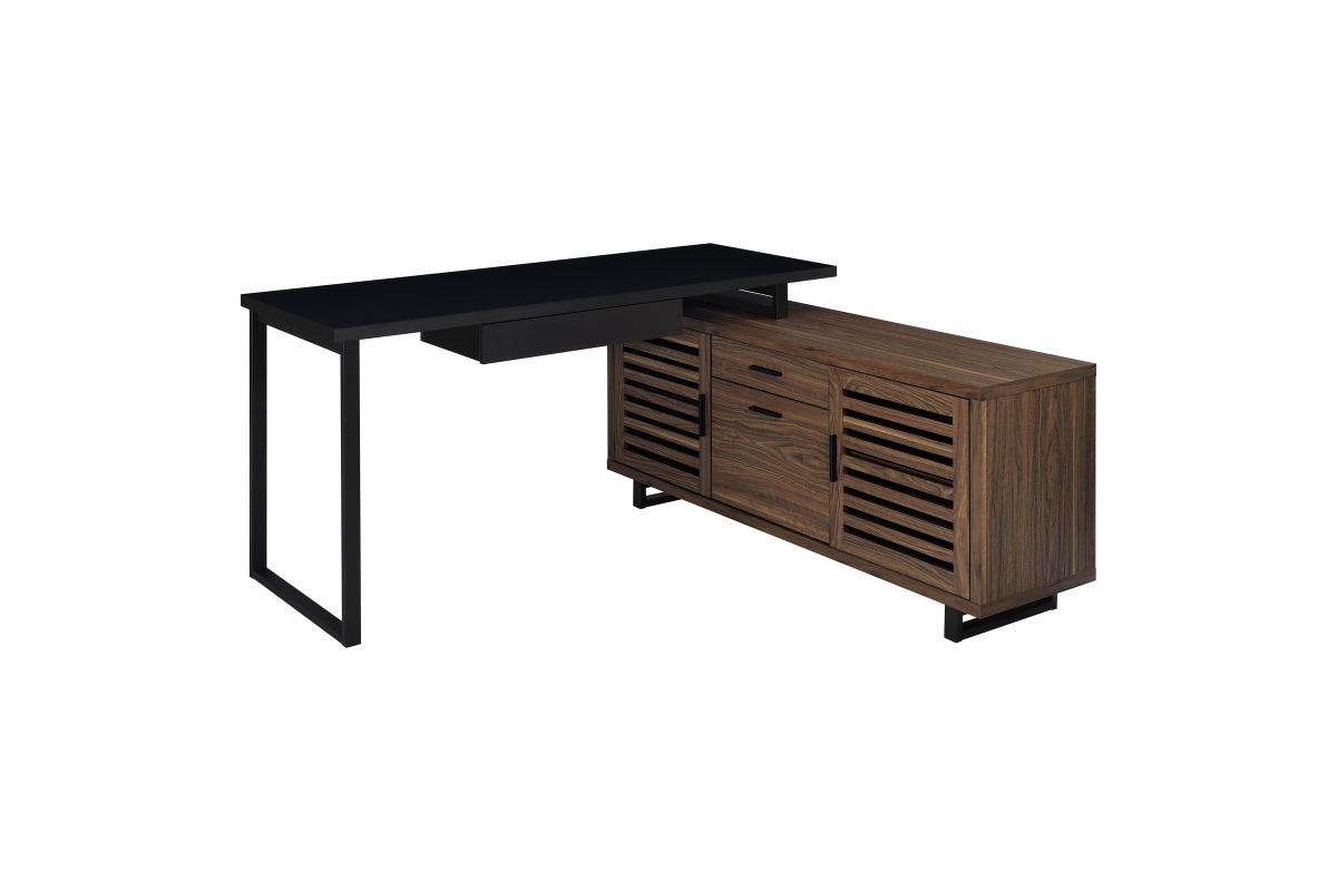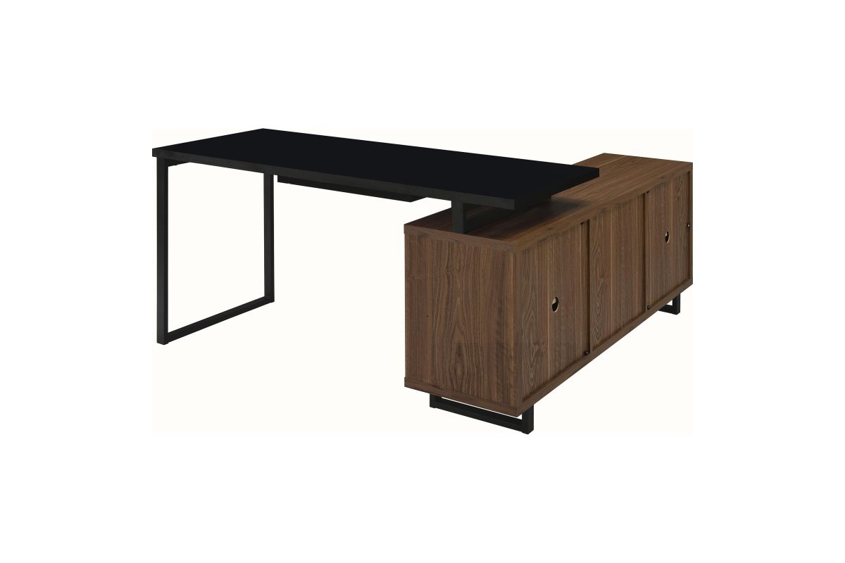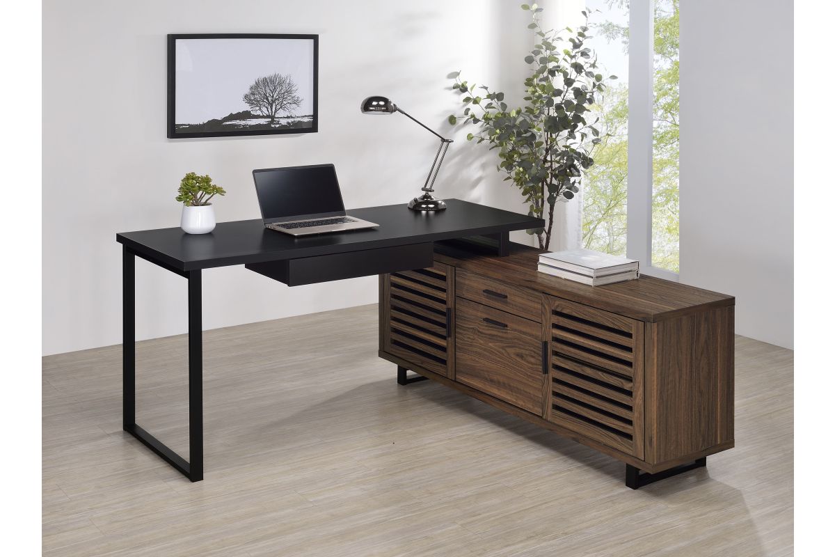 Create a custom workspace that maximizes both style and efficiency with this modern L-shaped executive desk. It features a high/low configuration, with a black finished workspace and drawer on one side and a storage credenza on the other. The credenza offers slats doors with adjustable shelving behind and center drawers for accessories. Its brown wood grain finish is made from melamine to match the black desk top, offering excellent durability. This charming desk blends into home office spaces and features metal legs that offer airy, light appeal.