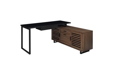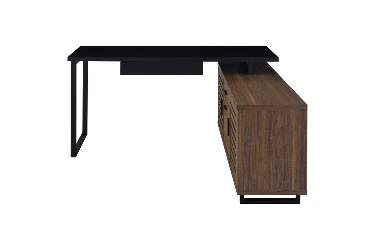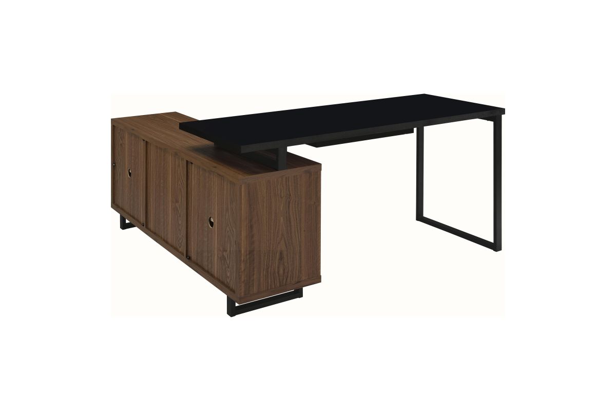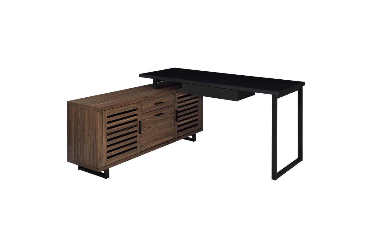 Create a custom workspace that maximizes both style and efficiency with this modern L-shaped executive desk. It features a high/low configuration, with a black finished workspace and drawer on one side and a storage credenza on the other. The credenza offers slats doors with adjustable shelving behind and center drawers for accessories. Its brown wood grain finish is made from melamine to match the black desk top, offering excellent durability. This charming desk blends into home office spaces and features metal legs that offer airy, light appeal.