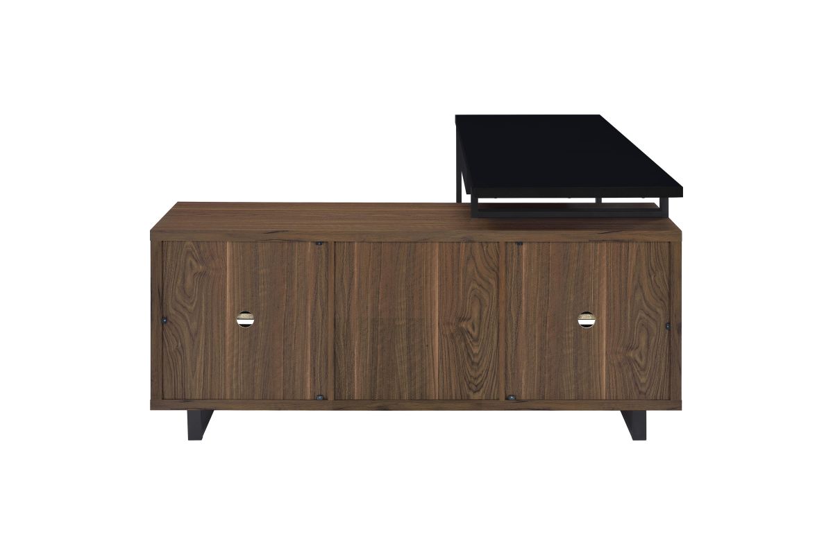 - Credenza section features a brown wood finish with multiple storage options and black finished legs