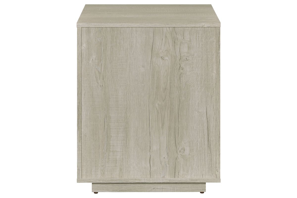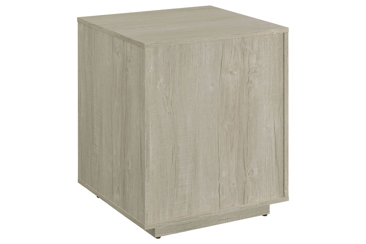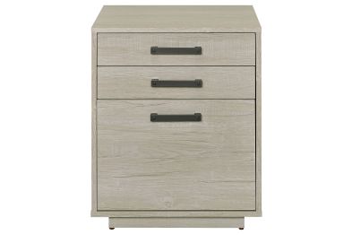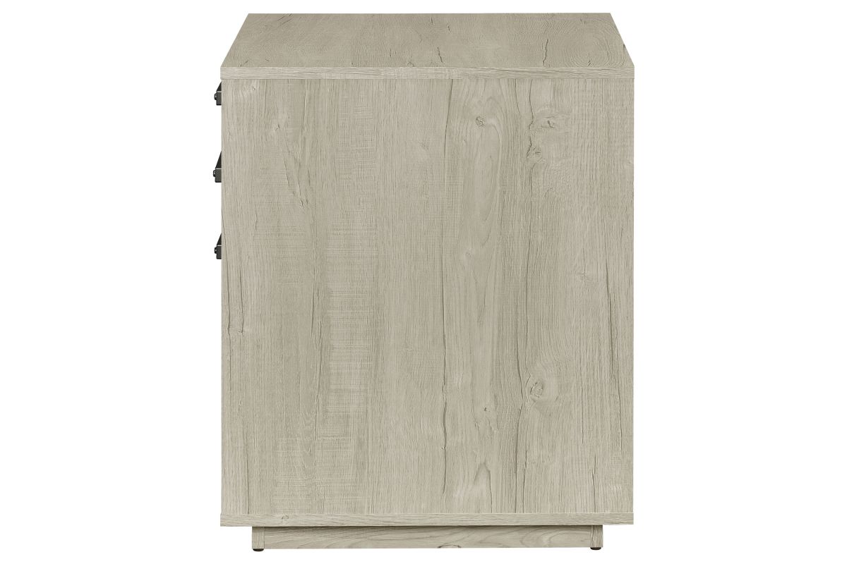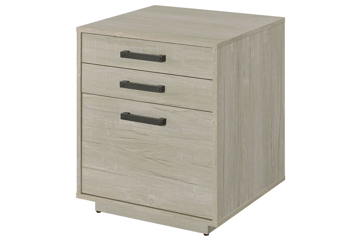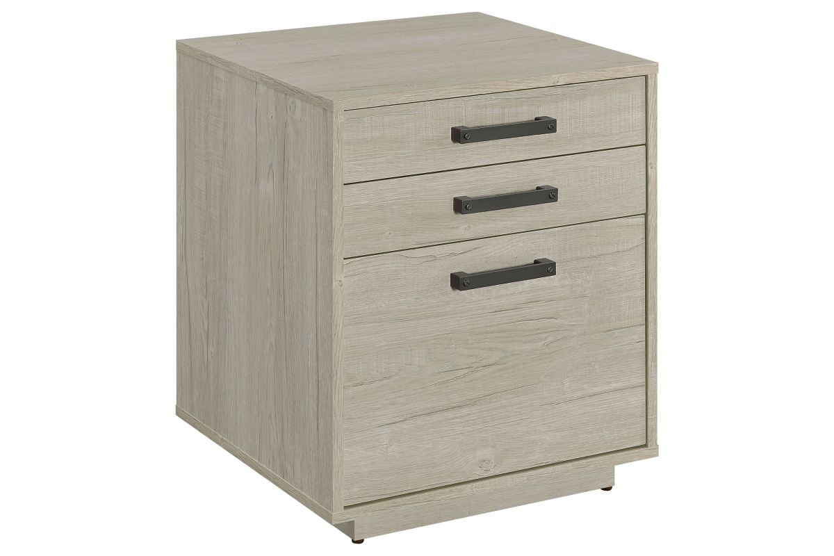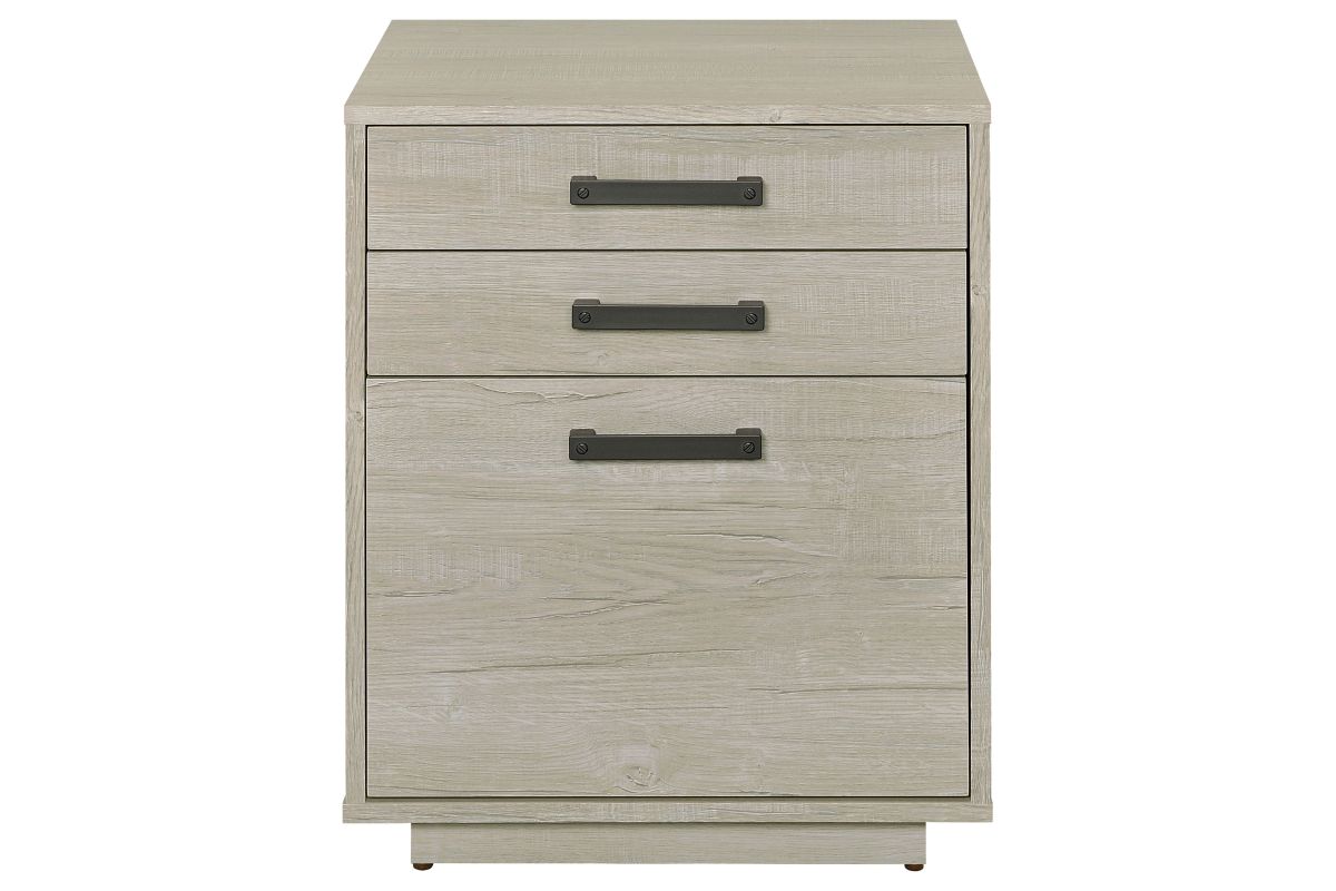 Streamline your workspace with this modern file cabinet, designed to enhance both form and function. The clean, box-style silhouette is finished in a soft whitewashed grey that brightens any office setting. Three spacious drawers provide organized storage for files, stationery, and office essentials. Sleek gunmetal bar pulls add an industrial touch, balancing the light tone with subtle contrast. Built from engineered wood and a durable laminate veneer, it offers strength and everyday practicality.