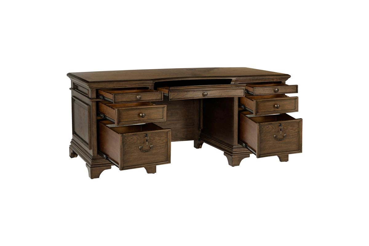 - Executive desk in burnished oak with seven total storage drawers