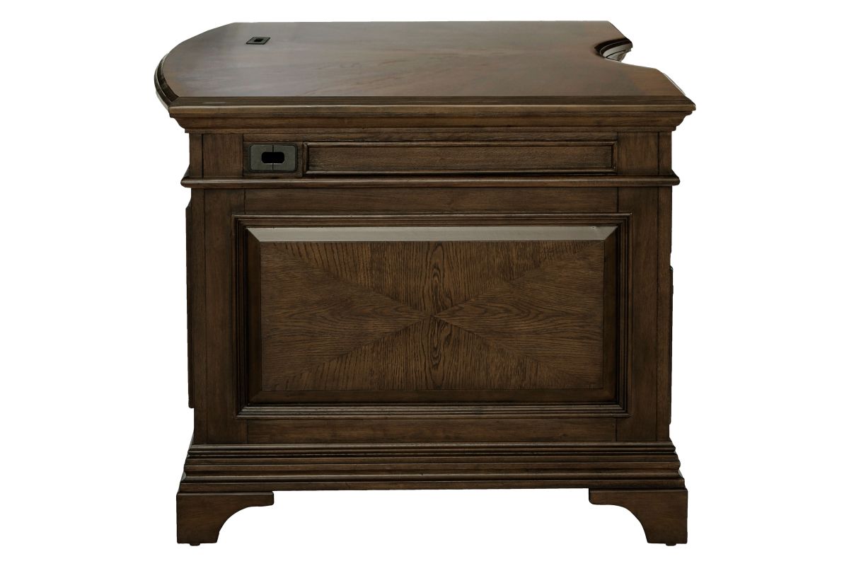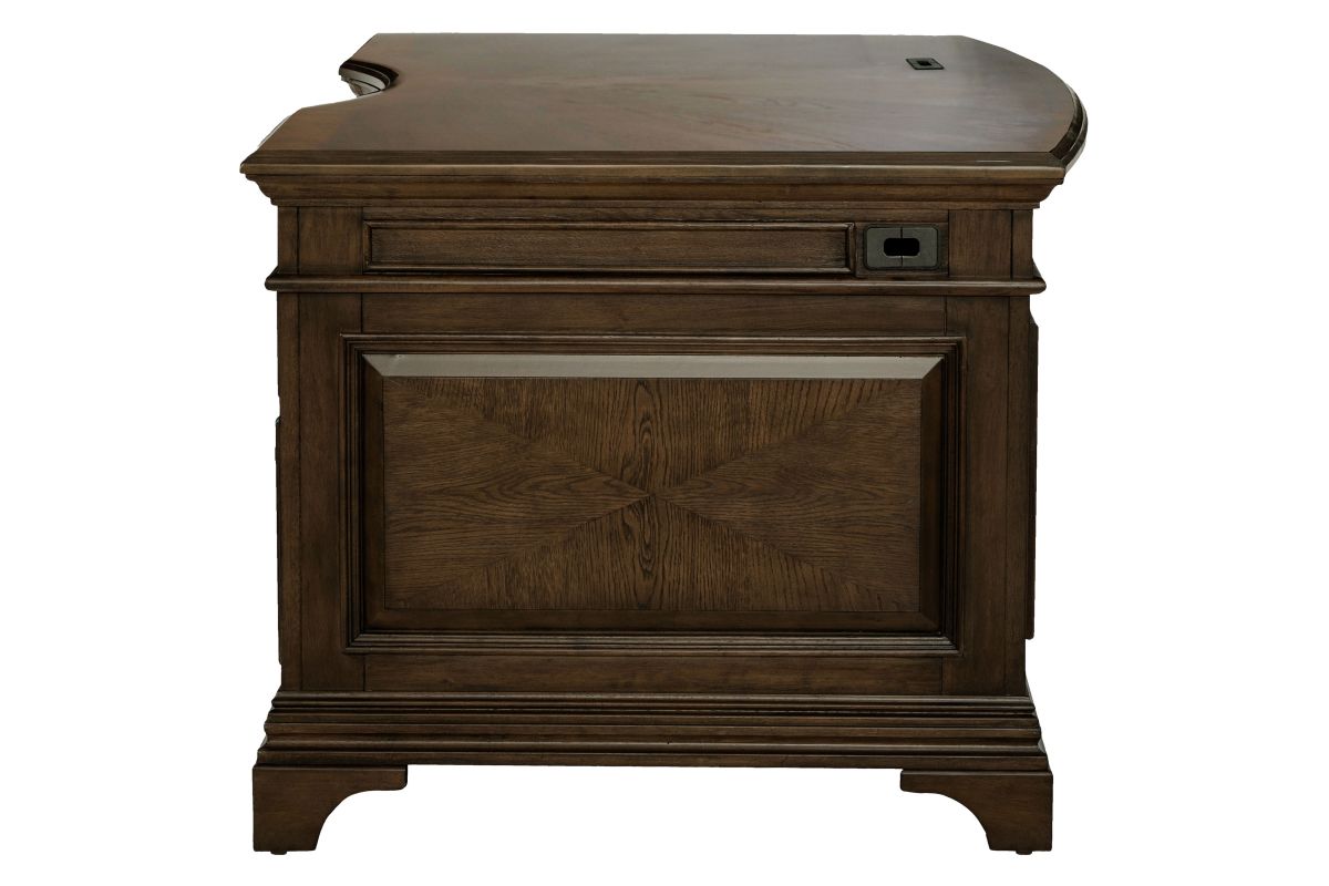 Feel like a CEO every day you sit down on this exquisite executive desk. Finished in burnished oak, it provides a traditional stylish flair to your office space. Two felt-lined top drawers allow you to store small items while you lock valuables inside the two built-in filing cabinets. Removable dividers help keep your area extra organized. With beautiful wood paneling on the frame, this wood executive desk will help your workday breeze by with its spectacular style and function.
