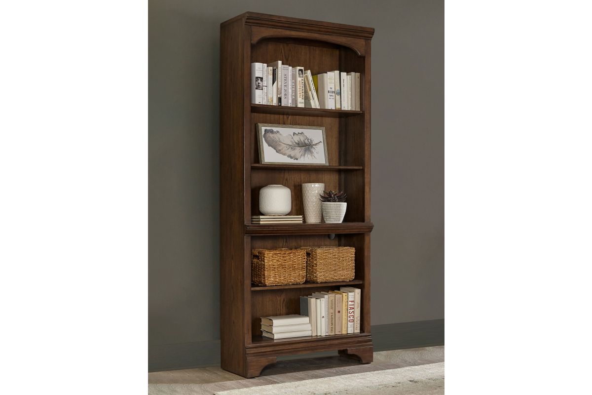 - Bookcase with five tiers of open shelving finished in warm burnished oak wood tone