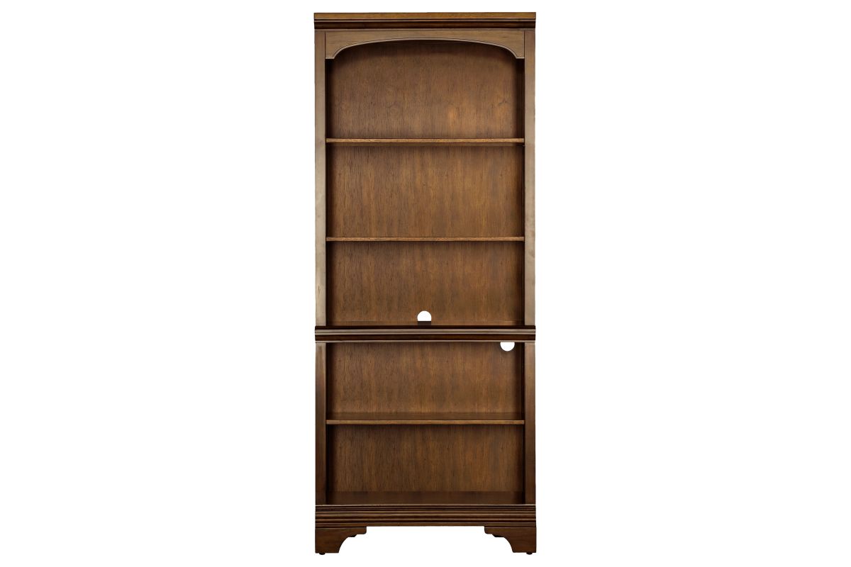 A traditional style bookcase is an elegant addition to offices and home libraries. This piece features five roomy shelves with plenty of space to arrange your favorite novels. Elegant detailing includes a stacked design on the top of the frame with a curved top. This piece is beautifully finished in burnished oak. It's supported on bracket style legs to bring stability.