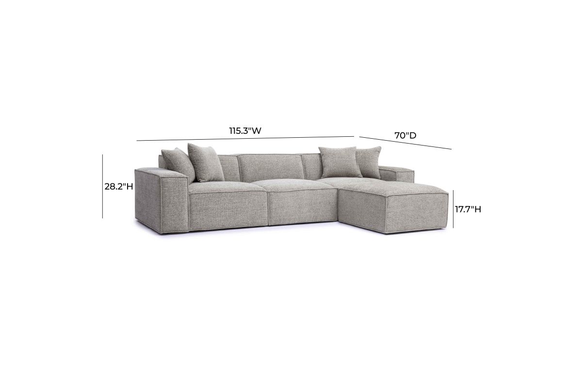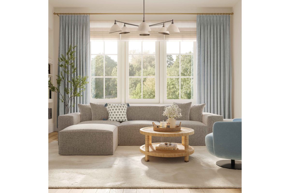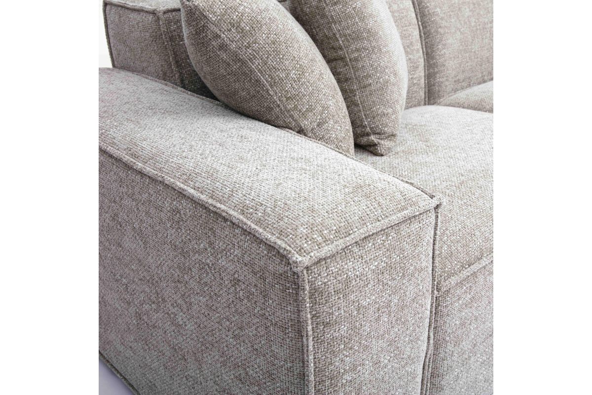 The Mindy Modular collection delivers cozy texture and standout style with its soft chenille basketweave, thick stitching, and plush accent pillows. Built for comfort with deep seating and endless ways to configure, it's available in cream, charcoal, or taupe to suit your space.
