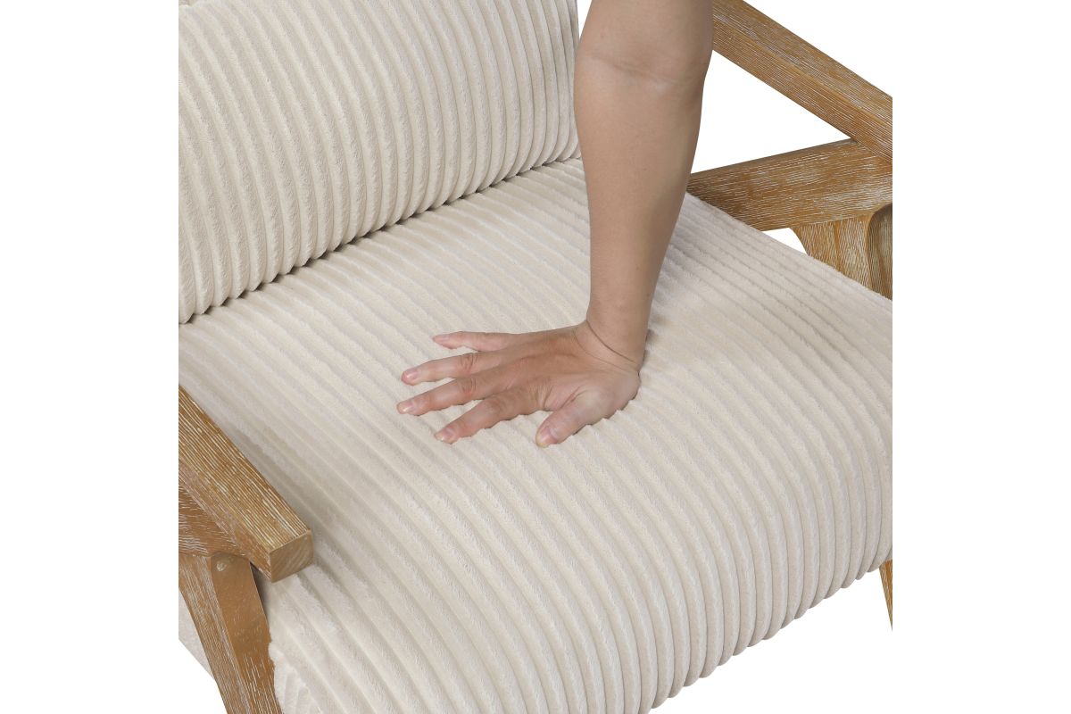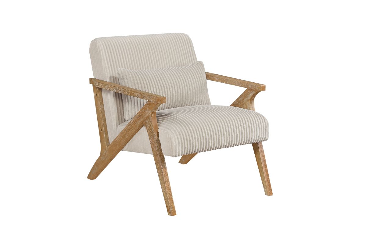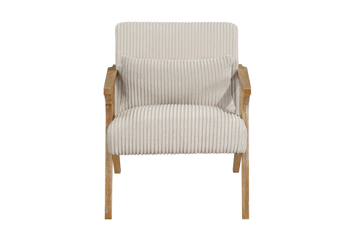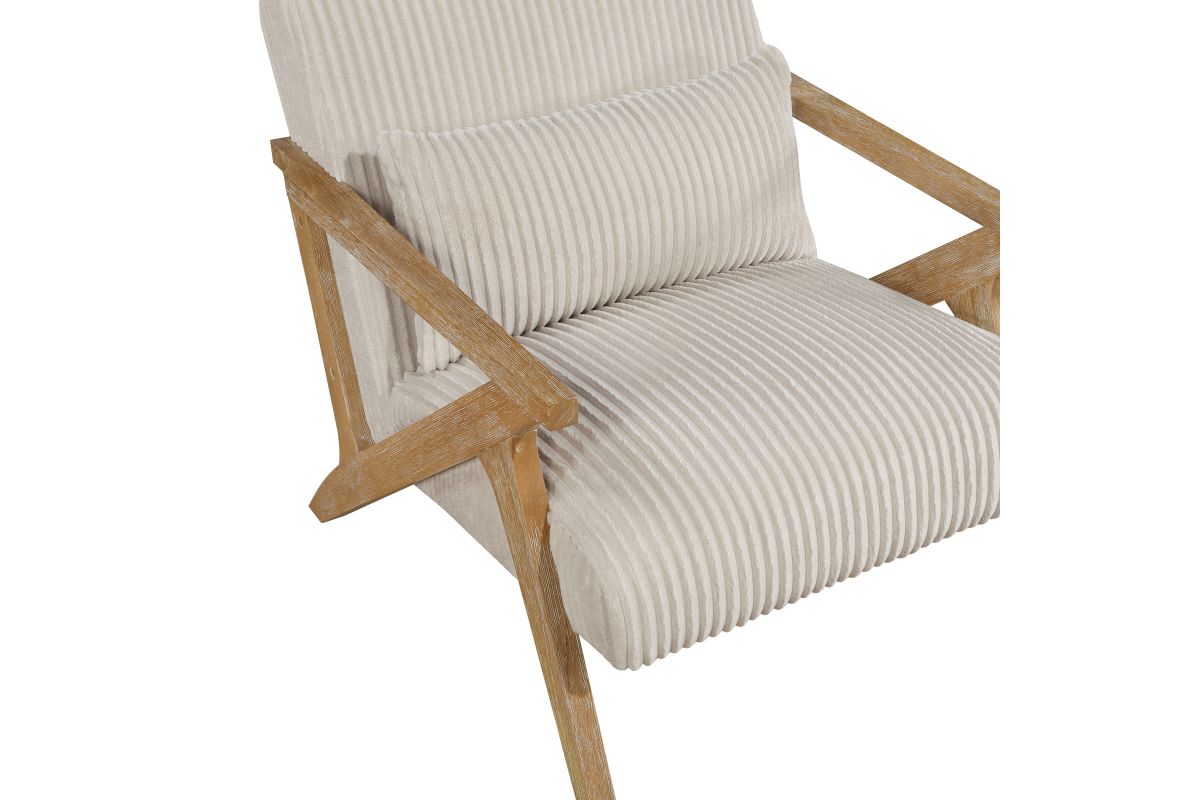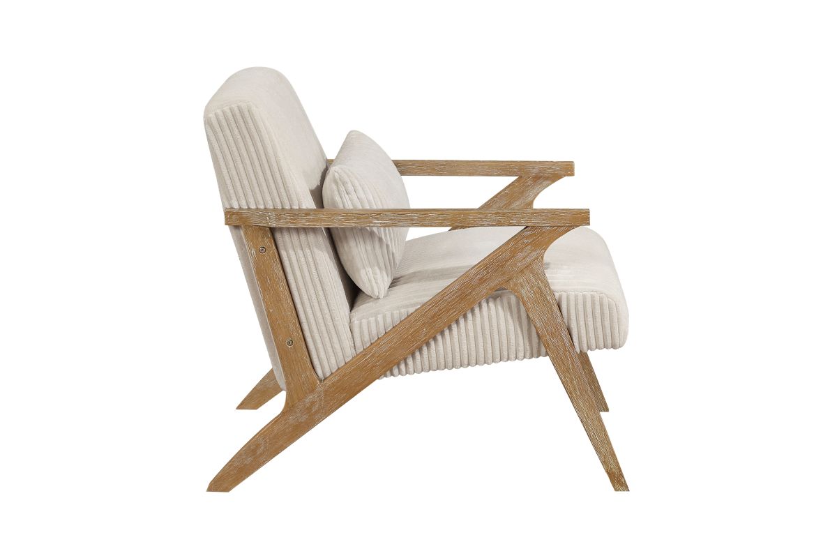 Bring inviting texture and relaxed modern style to your home with this plush corduroy accent chair. Designed with a gently distressed natural wood frame and signature mid-century inspired angles, this chair blends casual comfort with timeless character. The plush ribbed corduroy upholstery adds a warm, tactile feel, while the included lumbar pillow provides extra support for reading, lounging, or unwinding at the end of the day. Whether placed in a living room, bedroom corner, or cozy media space, this chair offers the perfect balance of softness, style, and everyday comfort. Its clean silhouette, sculpted arms, and artisan-touched wood grain make it a versatile statement piece that enhances both modern and transitional interiors.