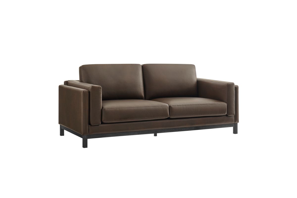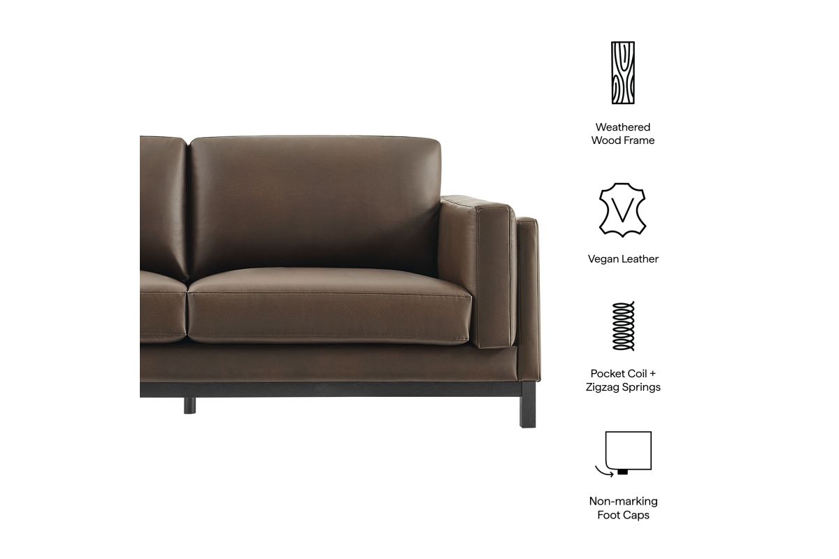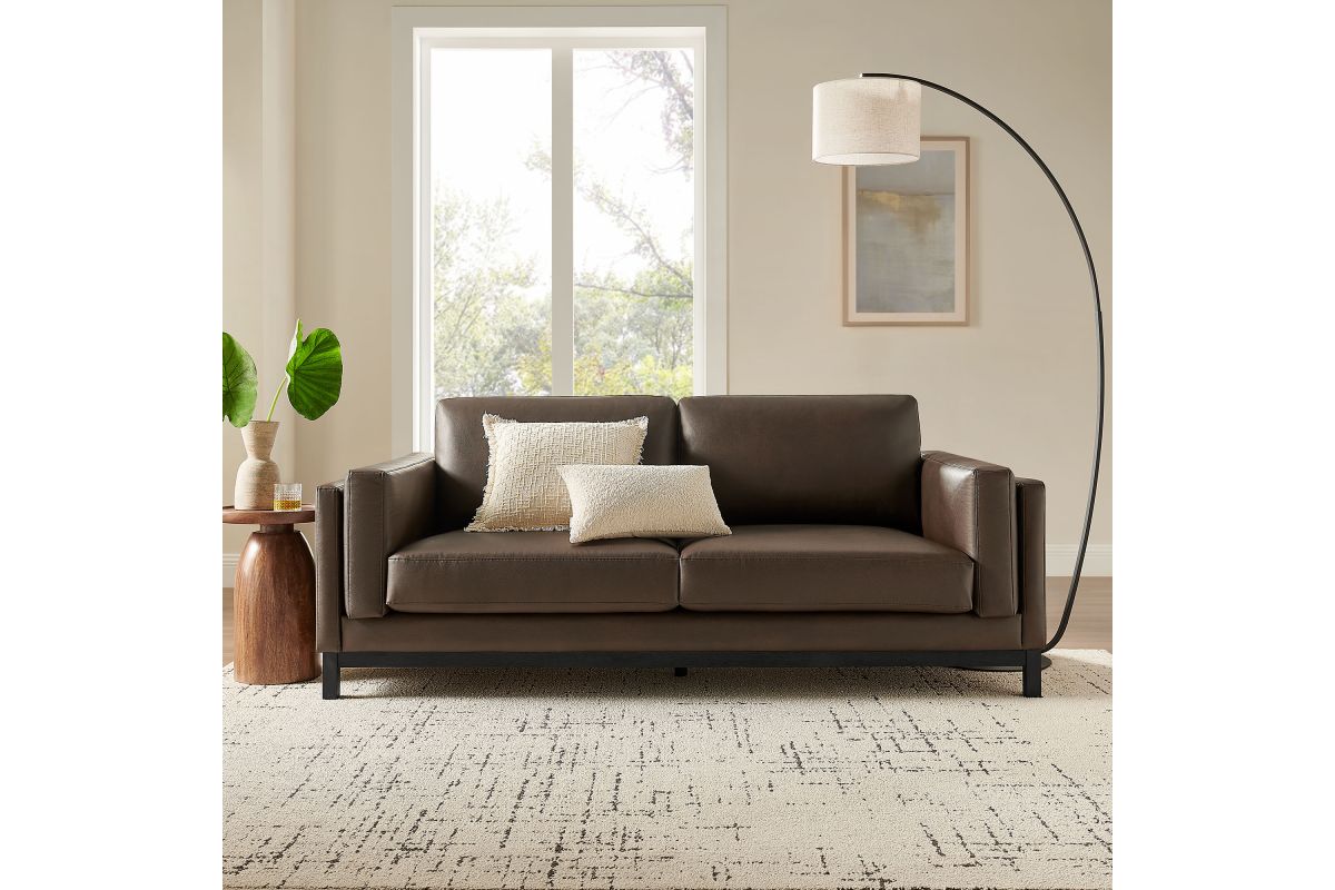 Refined lines and enduring design shape the Roscoe 81-Inch Lounge Sofa, a tailored take on American-traditional style. Upholstered in smooth vegan leather, this square couch features a deep, generous seat with plush back and seat cushions, made of high resiliency foam, further supported by spring pocket coils and sinuous springs for lasting comfort. The low, streamlined profile sits atop a kiln-dried weathered wood frame with integrated legs and non-marking foot caps for added stability and floor protection. A versatile faux leather couch for modern or classic interiors, Roscoe is the ideal deep seat couch—great as an office couch, apartment couch, or lounge couch for bedroom. Weight Capacity: 800 lbs.