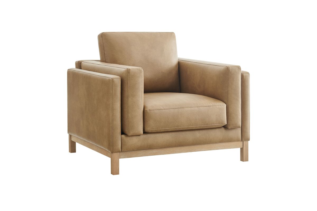 Refined lines and enduring design shape the Roscoe Armchair, a tailored take on American-traditional style. Upholstered in smooth vegan leather, this accent chair with arms features a deep, wide seat with plush back and seat cushions, made of high resiliency foam, further supported by spring pocket coils and sinuous springs for lasting comfort. The low, streamlined profile sits atop a kiln-dried weathered wood frame with integrated legs and non-marking foot caps for added stability and floor protection. A versatile faux leather accent chair for modern or classic interiors, Roscoe is great as a lounge chair for bedroom, corner reading chair, or living room leather chair. Weight Capacity: 800 lbs.
