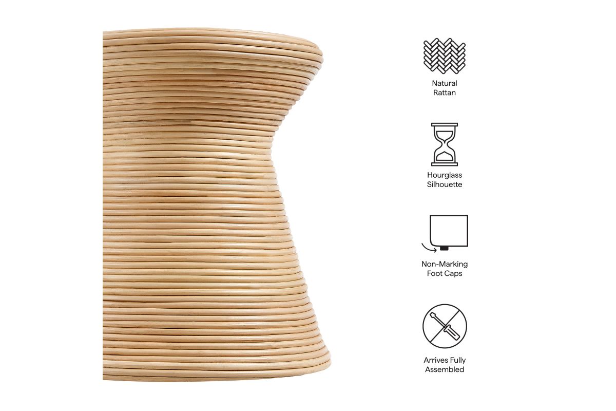 Sculptural yet grounded, the Tavi Round Side Table brings natural charm to living rooms, bedrooms, and sun-drenched nooks. Featuring an airy hourglass shape made of natural rattan, this round accent table adds texture and visual interest to any space. Use it as a perch for books, plants, or a morning coffee beside your favorite lounge chair. Designed for everyday ease, Tavi arrives fully assembled and includes non-marking foot caps to help protect wood or tile floors. While intended for indoor use, it also makes a stylish addition to covered patios or breezy garden rooms. Product Note: Due to the natural qualities of rattan, slight variations in color and pattern are to be expected, adding to each piece's unique character.