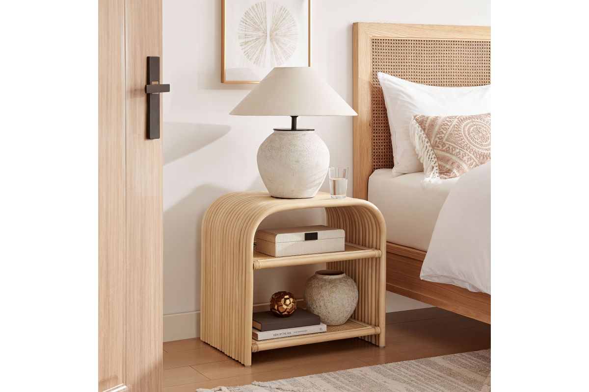 Bring a relaxed feel to your space with the Eve Natural Rattan Curved Side Table. Featuring a rounded profile and airy silhouette, this wide accent table or nightstand is crafted from natural woven rattan with curved lines for an organic, easygoing look. A fixed shelf offers room to stow books, candles, or small essentials, while non-marking foot caps help protect wood or tile floors. Perfect beside a reading chair, in a sunroom, or even on a covered patio, Eve arrives fully assembled and ready to add appeal and function wherever it’s placed. Product Note: Due to the natural qualities of rattan, slight variations in color and pattern are to be expected, adding to each piece’s unique character.
