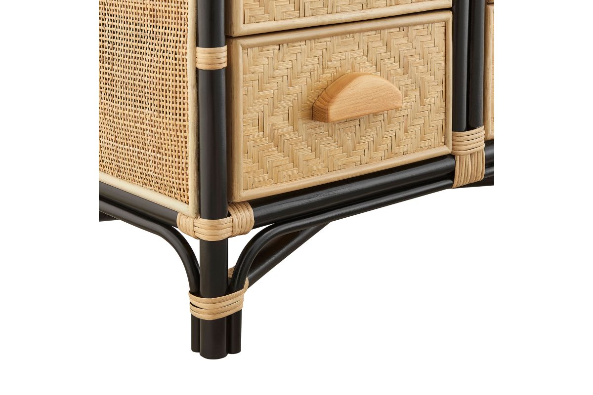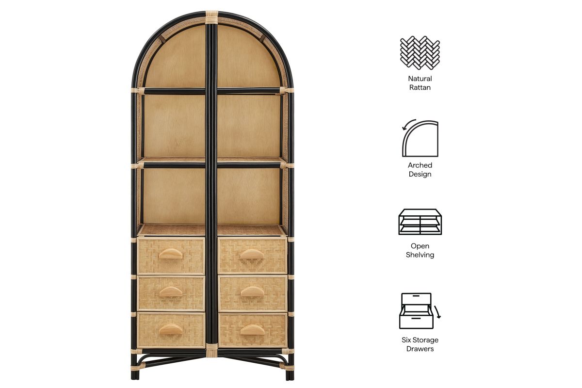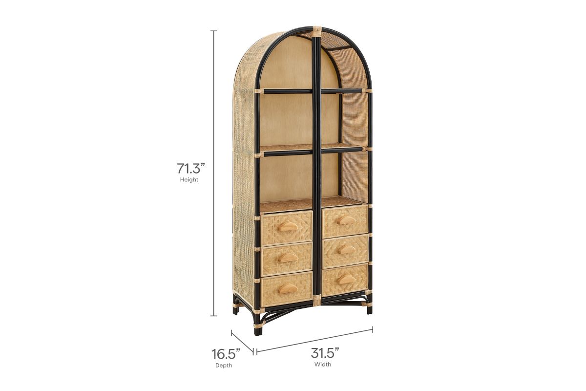 The 71" Jane arched bookcase offers a relaxed, artful take on everyday organization. Crafted from wood and natural rattan, this sculptural arched bookshelf features three open shelves—ideal for books, folded towels, or baskets—and six woven drawers below for stashing away smaller items. The gently curved frame and arched drawer pulls give it a soft, balanced look, while the sturdy X-cross base design adds unique character and support. Complete with non-marking foot caps, this bookshelf with storage arrives fully assembled and brings easy function and thoughtful style to any living room storage or bathroom space. Product Note: Due to the natural qualities of rattan, slight variations in color and pattern are to be expected, adding to each piece’s unique character.