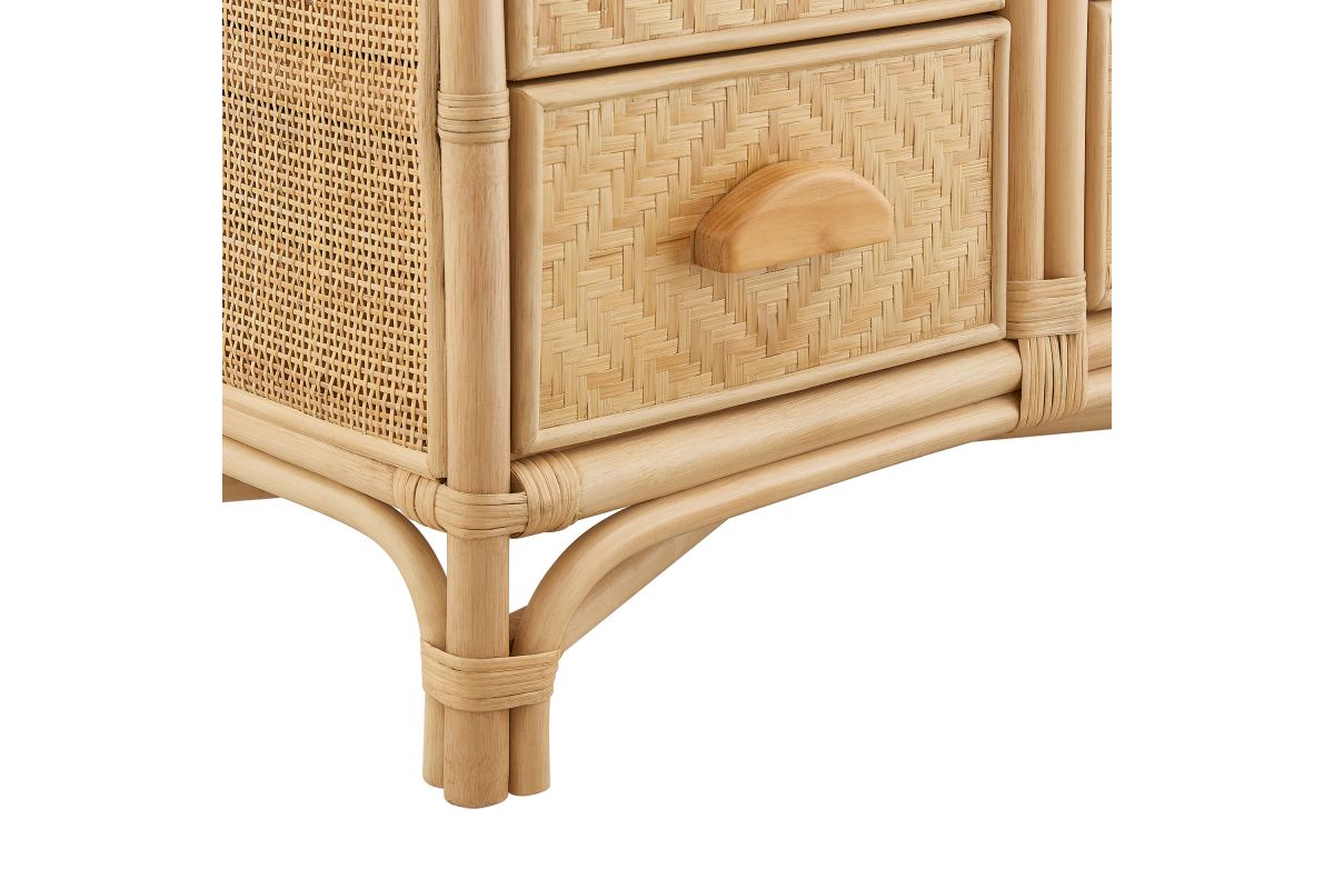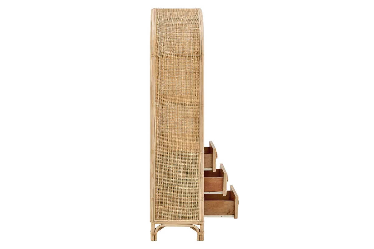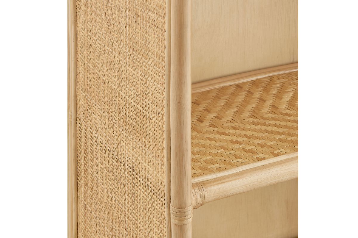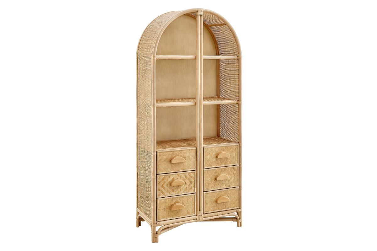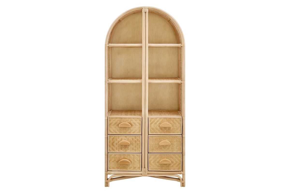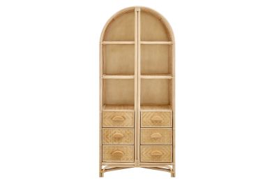 The 71" Jane arched bookcase offers a relaxed, artful take on everyday organization. Crafted from wood and natural rattan, this sculptural arched bookshelf features three open shelves—ideal for books, folded towels, or baskets—and six woven drawers below for stashing away smaller items. The gently curved frame and arched drawer pulls give it a soft, balanced look, while the sturdy X-cross base design adds unique character and support. Complete with non-marking foot caps, this bookshelf with storage arrives fully assembled and brings easy function and thoughtful style to any living room storage or bathroom space. Product Note: Due to the natural qualities of rattan, slight variations in color and pattern are to be expected, adding to each piece’s unique character.