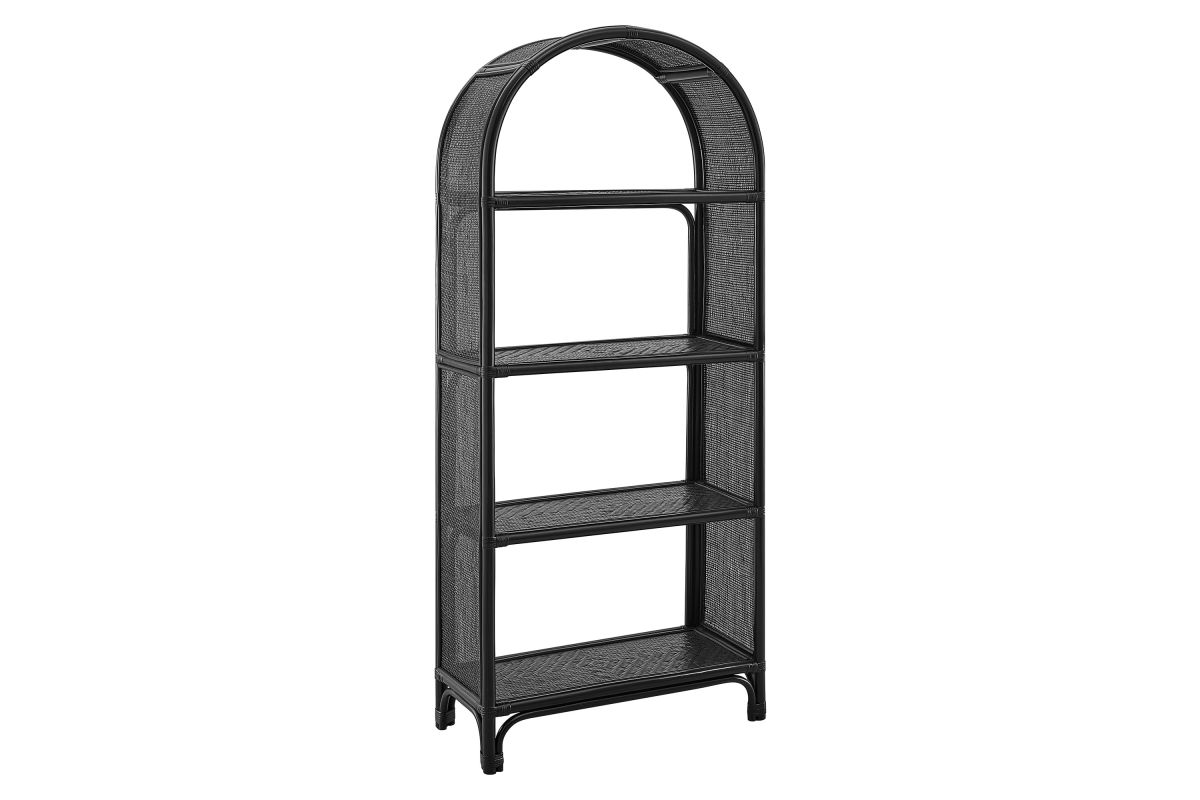 The 67" Celeste Arched Bookcase offers a relaxed, artful take on everyday organization. Crafted from wood and natural rattan, this open-back bookcase features four spacious shelves—perfect for books, towels, baskets, or decorative pieces—while its airy frame brings visual lightness to any room. The curved top and elevated legs lend a refined, architectural feel, and non-marking foot caps protect your floors. Fully assembled and ready to style, it’s a versatile addition to any living room or office. Product Note: Due to the natural qualities of rattan, slight variations in color and pattern are to be expected, adding to each piece’s unique character.