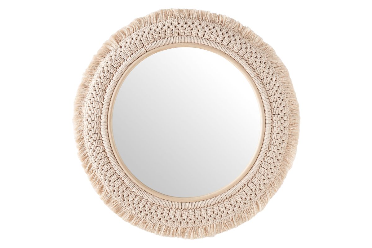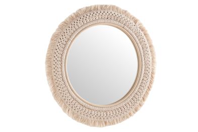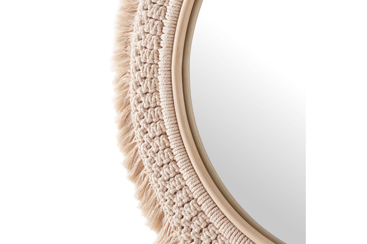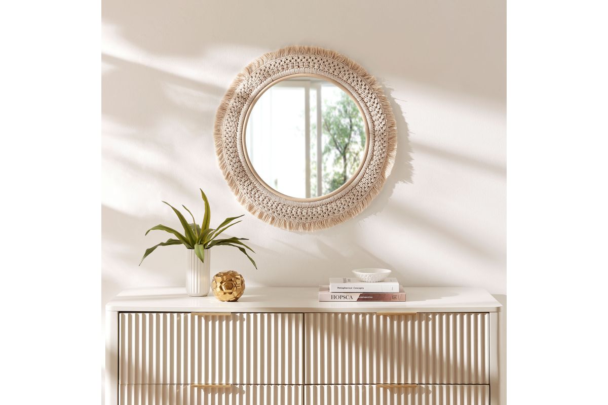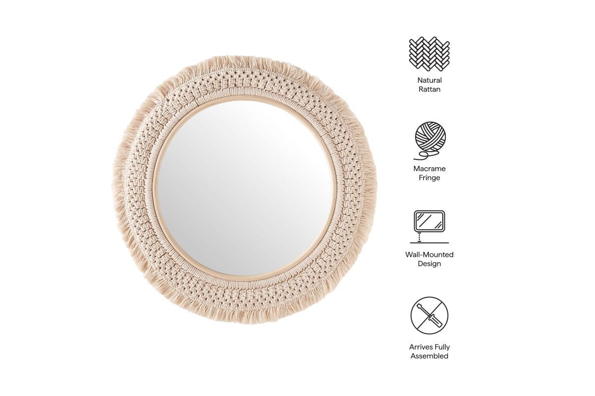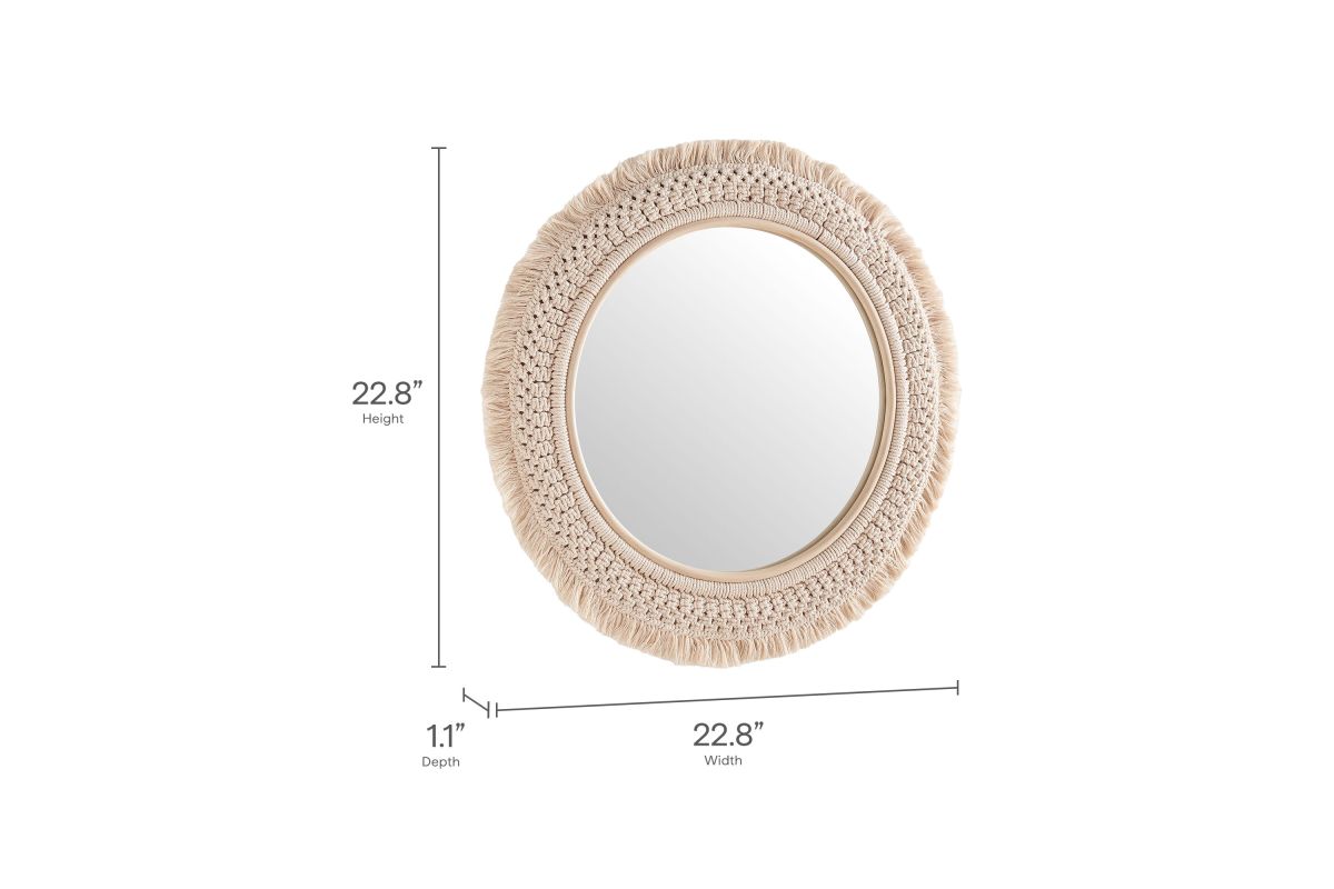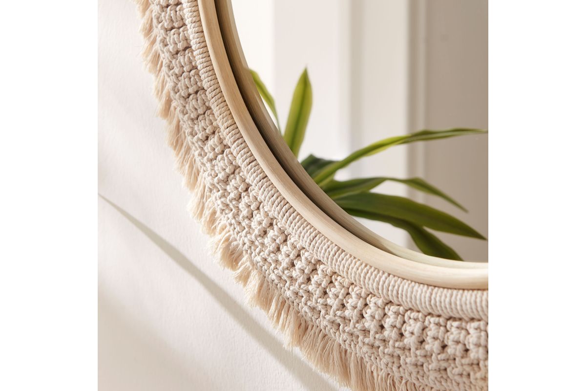 Add a relaxed, organic touch to your home with the Jade Wall Mount Mirror, a rattan wall mirror wrapped in handwoven macrame design using soft cotton for a breezy, boho bathroom mirror look. This round mirror adds vintage charm with its natural materials and soft fringe detailing, making it a standout piece in any bedroom, hallway, or vanity setup. Designed for effortless styling, the Jade Macrame Mirror arrives fully assembled and ready to hang, instantly transforming blank walls into curated corners. A true accent that blends art and utility, it’s the perfect rattan mirror for laid-back, retro-inspired interiors. Product Note: Due to the natural qualities of rattan, slight variations in color and pattern are to be expected, adding to each piece’s unique character.