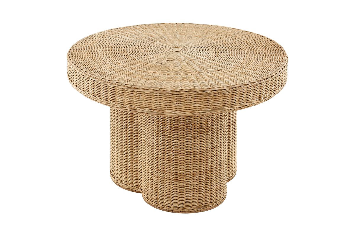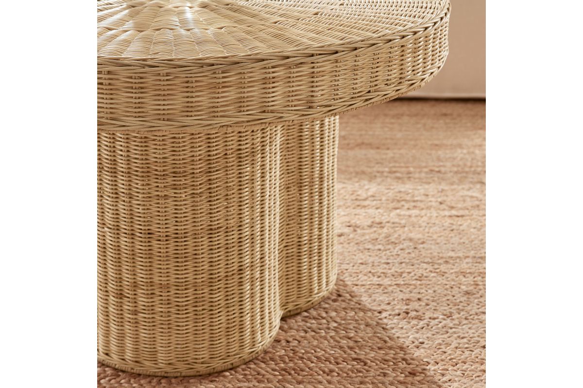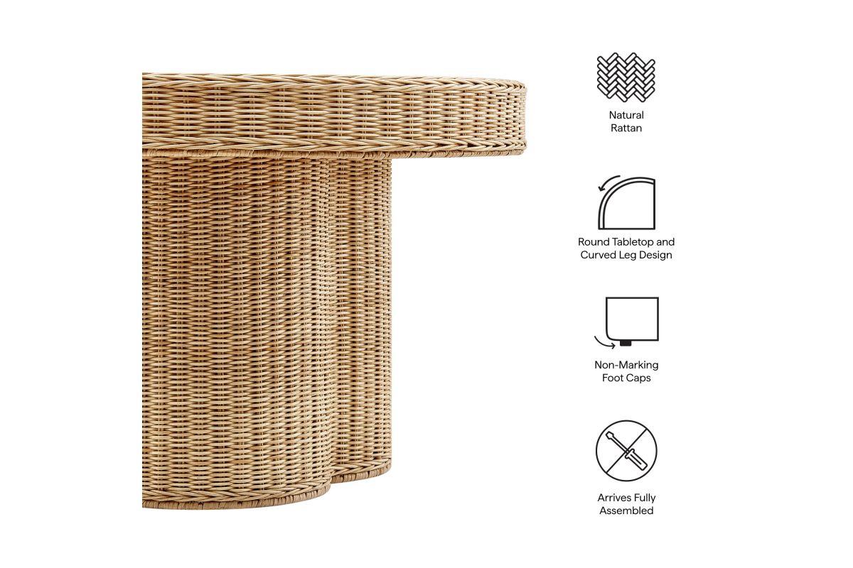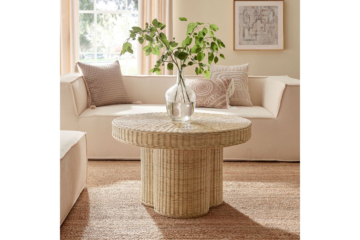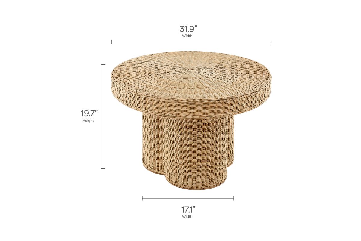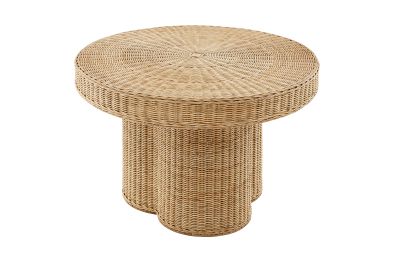 The Ainsley 32" Round Coffee Table adds natural texture and an artful shape to living rooms, sunrooms, and cozy indoor lounges. Made entirely from natural rattan, its sculpted three-pillar base forms a rounded triangle silhouette that feels both organic and architectural—offering more visual interest than a standard pedestal. Topped with a spacious 32-inch surface, this woven accent table is ideal for serving snacks, holding drinks, or displaying your favorite décor. Designed for everyday use, it arrives fully assembled and features non-marking foot caps to help protect floors. Whether styled indoors or on a covered patio, Ainsley brings an easygoing, relaxed vibe to any setup. Product Note: Due to the natural qualities of rattan, slight variations in color and pattern are to be expected, adding to each piece’s unique character.