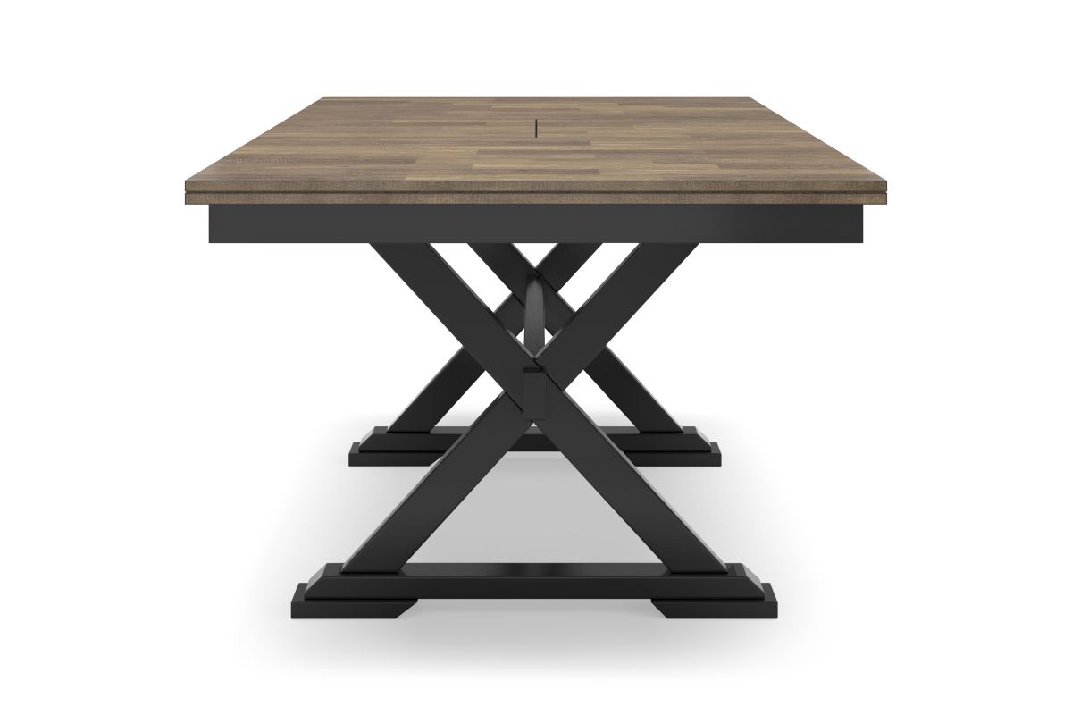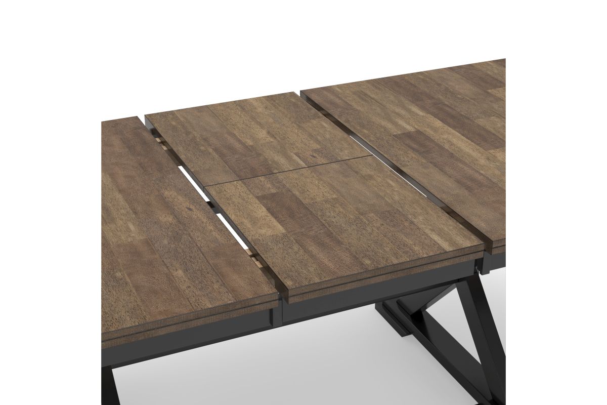 - 2-tone finish (butcher block mango veneer top with deep brown wood tone finish; frame with warm satin black finish)