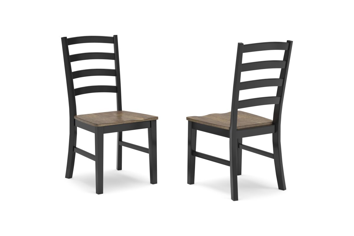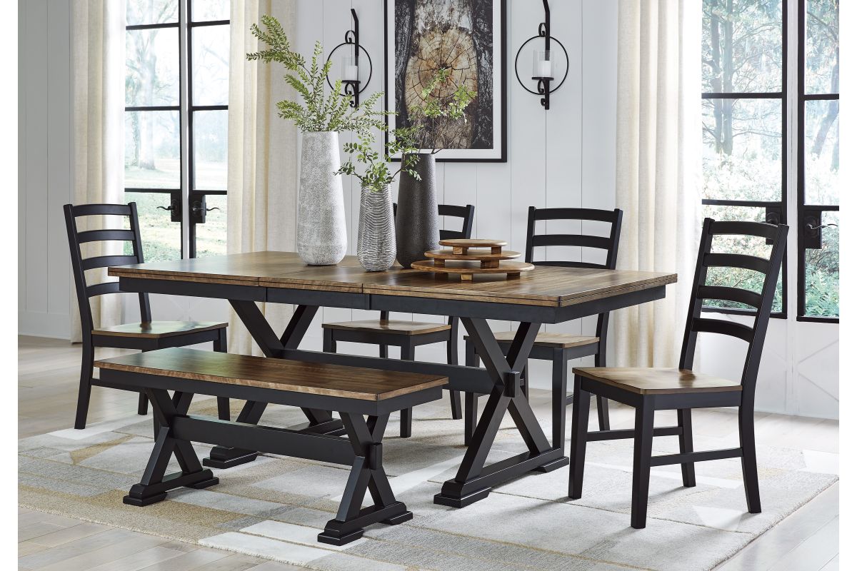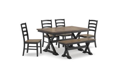 Modern farmhouse styling with a handsome two-tone finish and crisp lines. The set includes a sturdy wood table and matching chairs with clean silhouette details—great for casual or contemporary dining spaces.