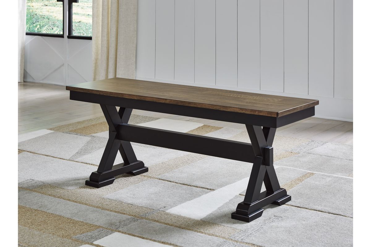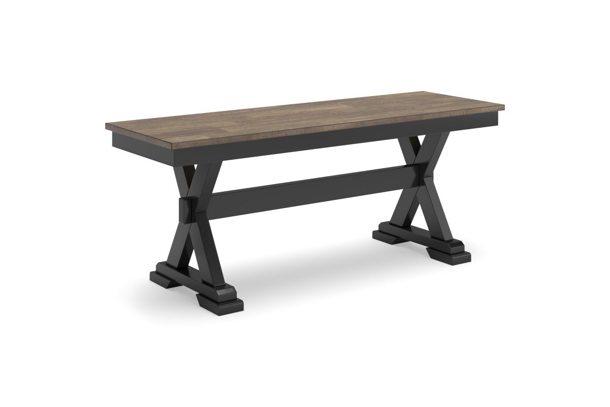 - 2-tone finish (butcher block mango veneer top with deep brown wood tone finish; frame with warm satin black finish)