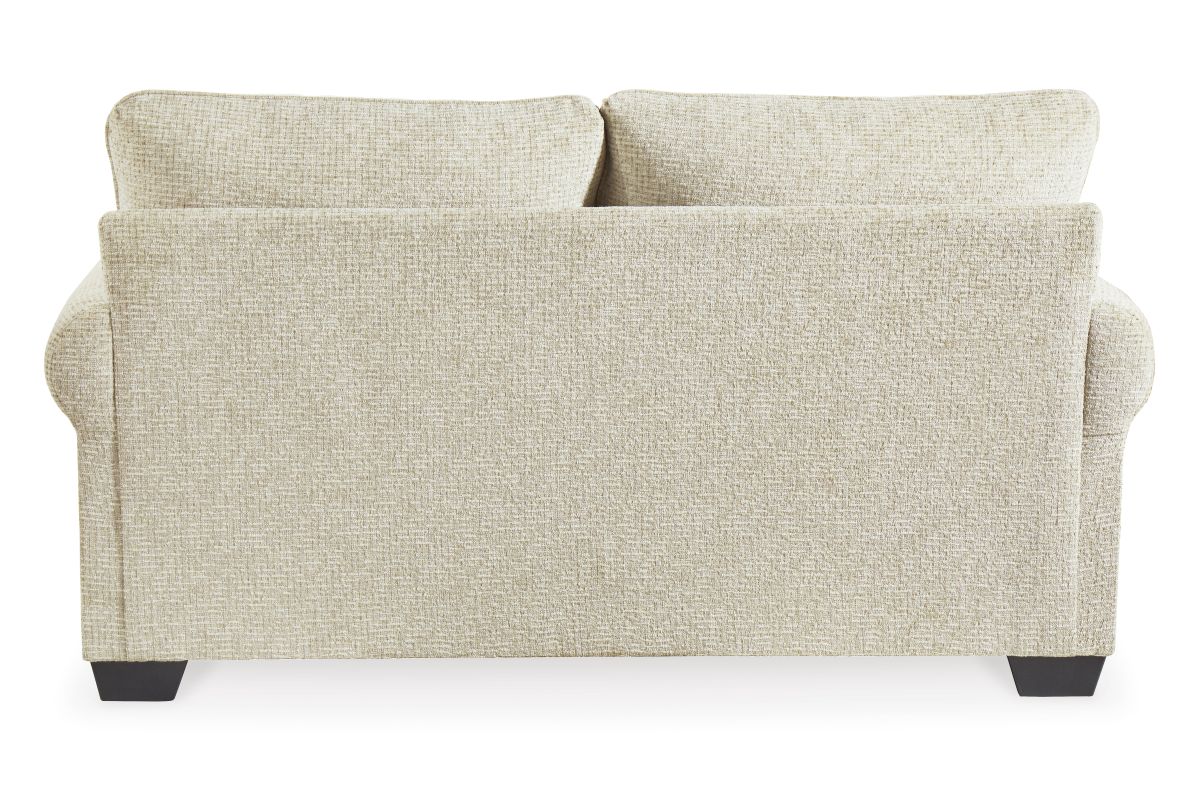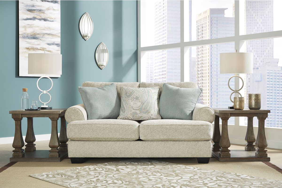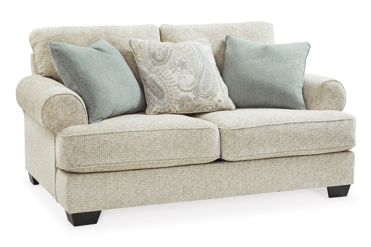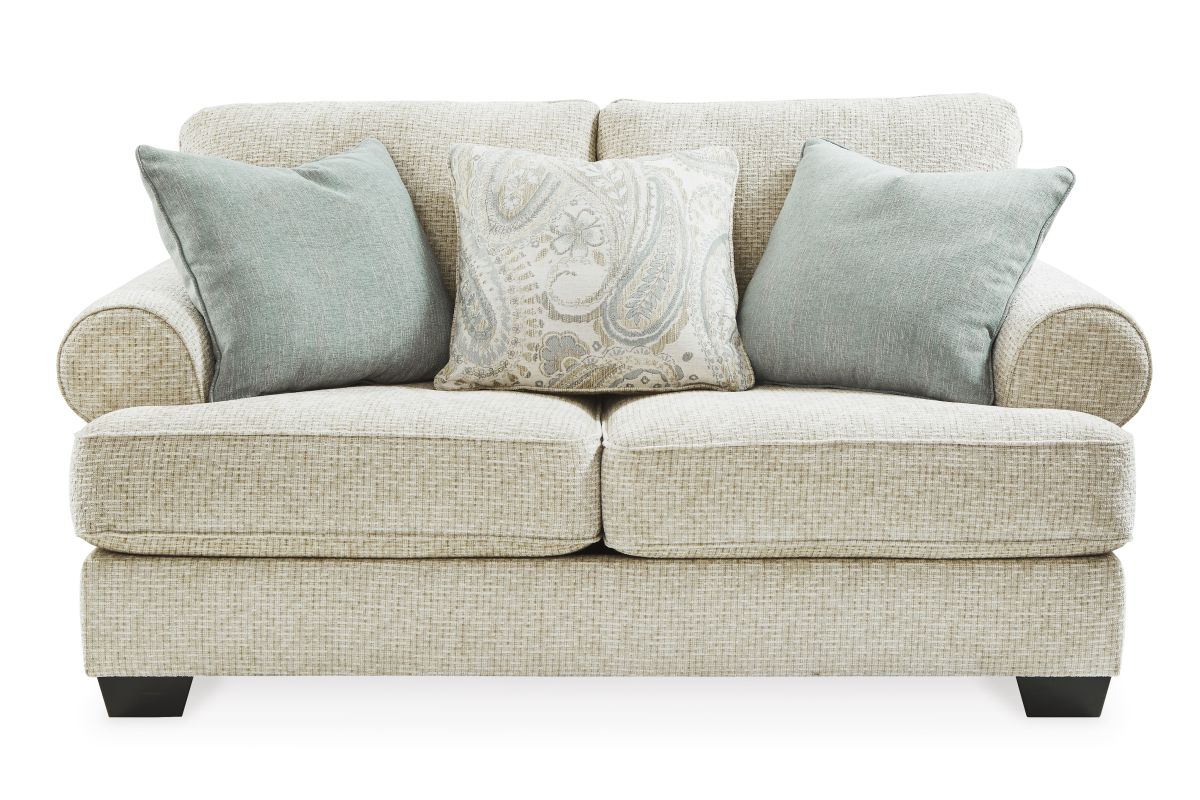 This loveseat strikes a beautiful balance between classic and current. Its traditional elements include t-cushion seating and setback roll arms, angled for modern flair. Posh pillows in spa mist and jacquard paisley make a muted, mellow complement to the loveseat's casual textured chenille upholstery. And the choice of sandstone beige is a light and lovely style awakening.