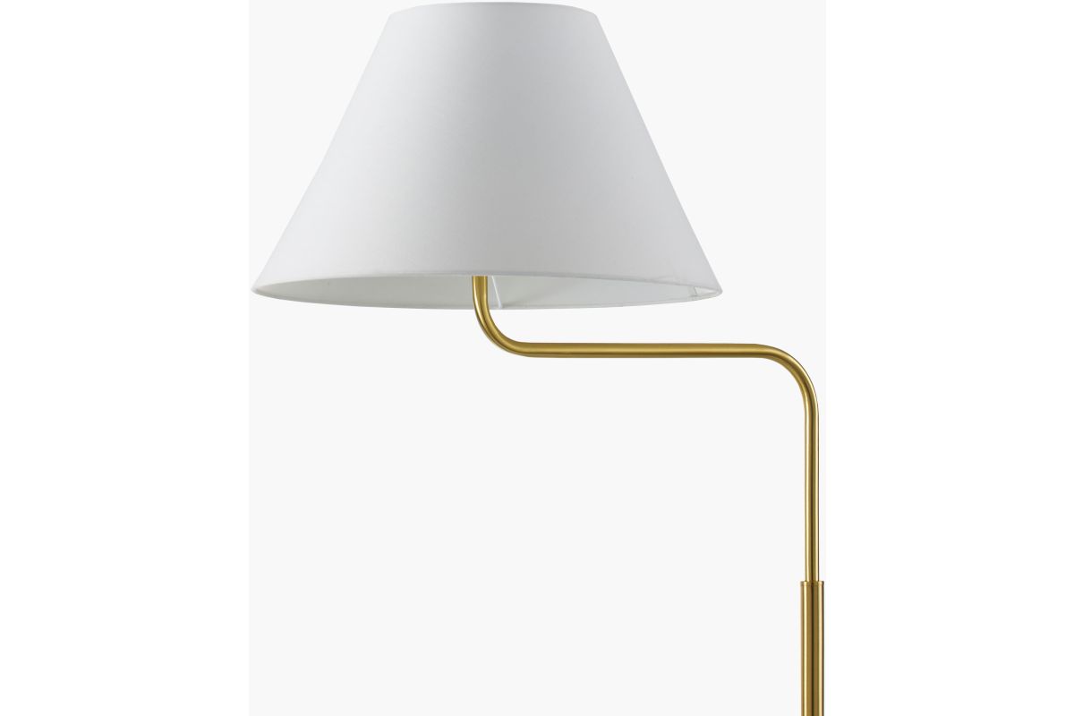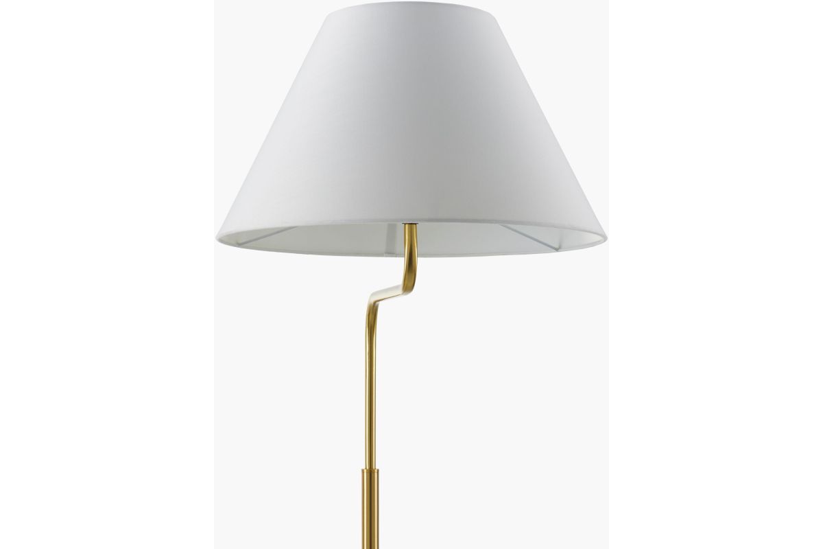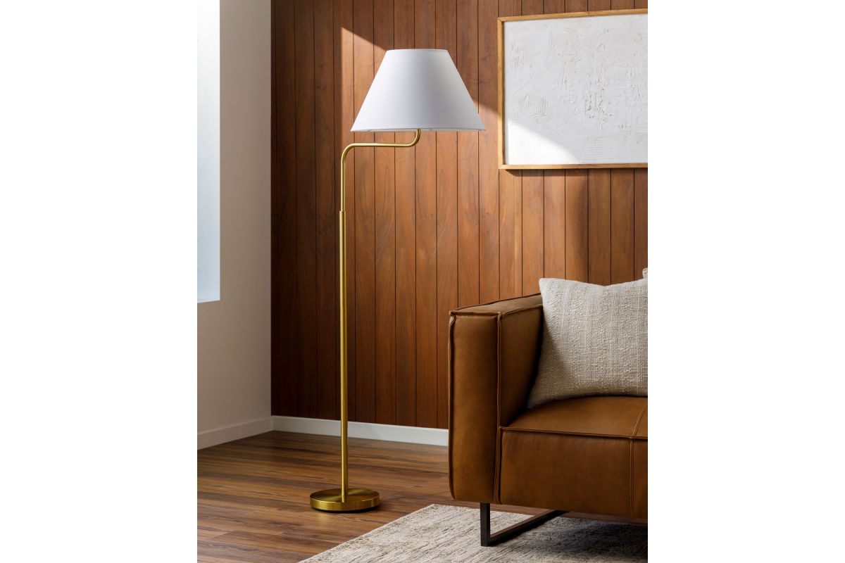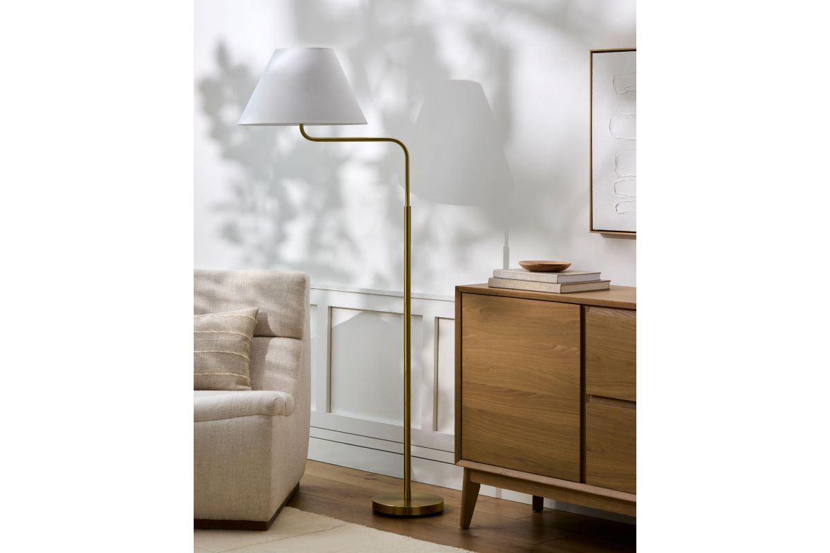 The Arcane Accent Floor Lamp brings sleek sophistication to any space with its minimalist silhouette and warm brass finish. Crafted from iron with a plated metallic brass body and base, this lamp offers a refined, contemporary look that feels both timeless and elevated. The slender profile is complemented by a crisp white cotton shade that softly diffuses light, creating a warm, ambient glow.