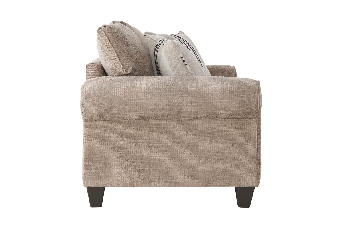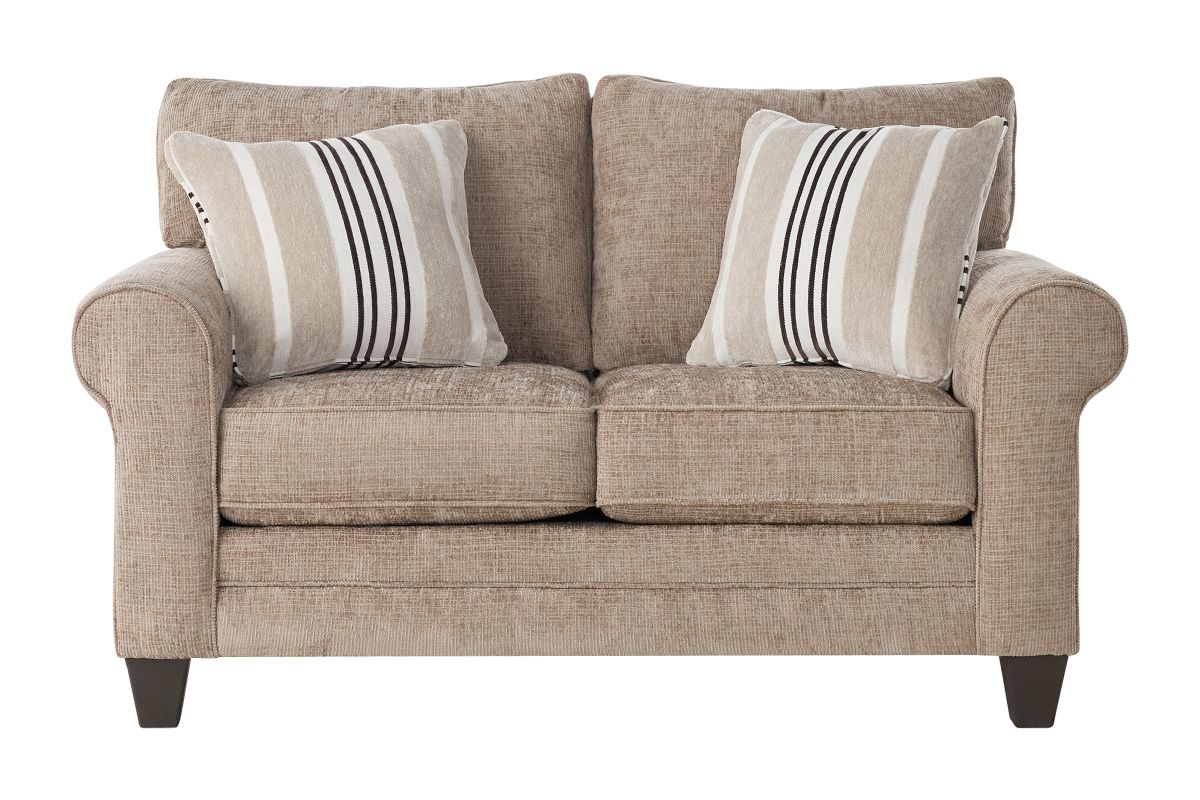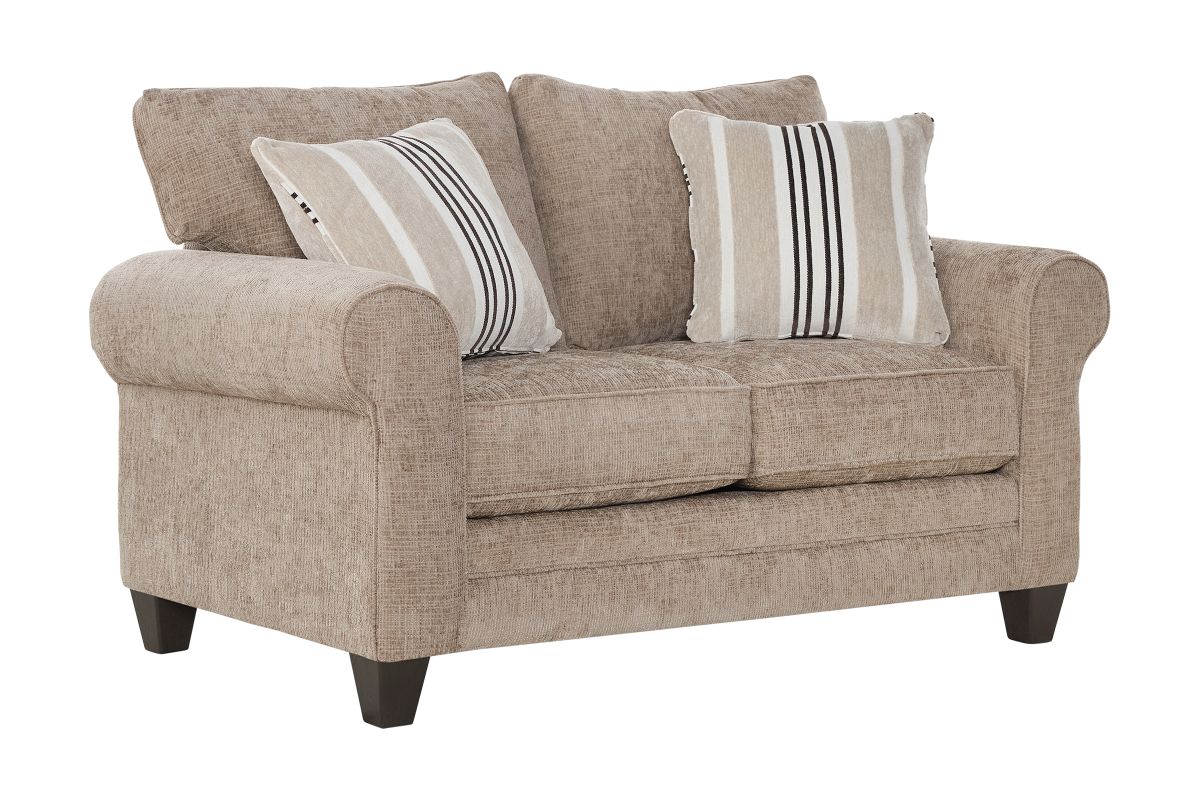 Classic rolled arms and tailored detailing give the loveseat a refined yet relaxed look, while plush seat and back cushions offer exceptional comfort for lounging or conversation. Coordinating accent pillows introduce subtle contrast and texture, completing the loveseat’s cozy, polished appearance.