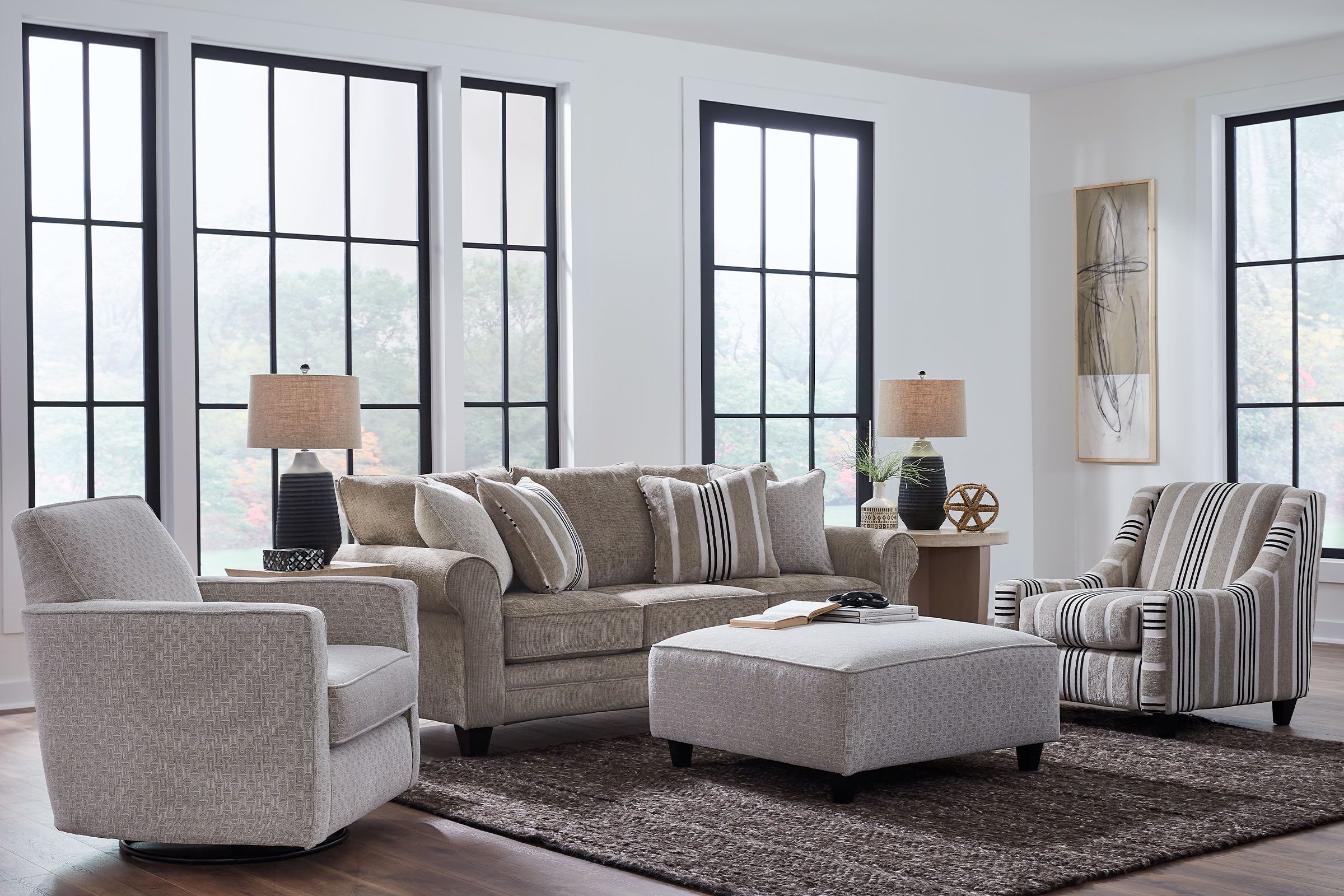 Classic rolled arms and tailored detailing give the Bradford a refined silhouette, while plush seat and back cushions provide sink-in comfort perfect for lounging, entertaining, or relaxing at the end of the day. Coordinating accent pillows add a subtle layer of pattern and contrast, enhancing the sofa’s cozy yet polished look.