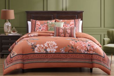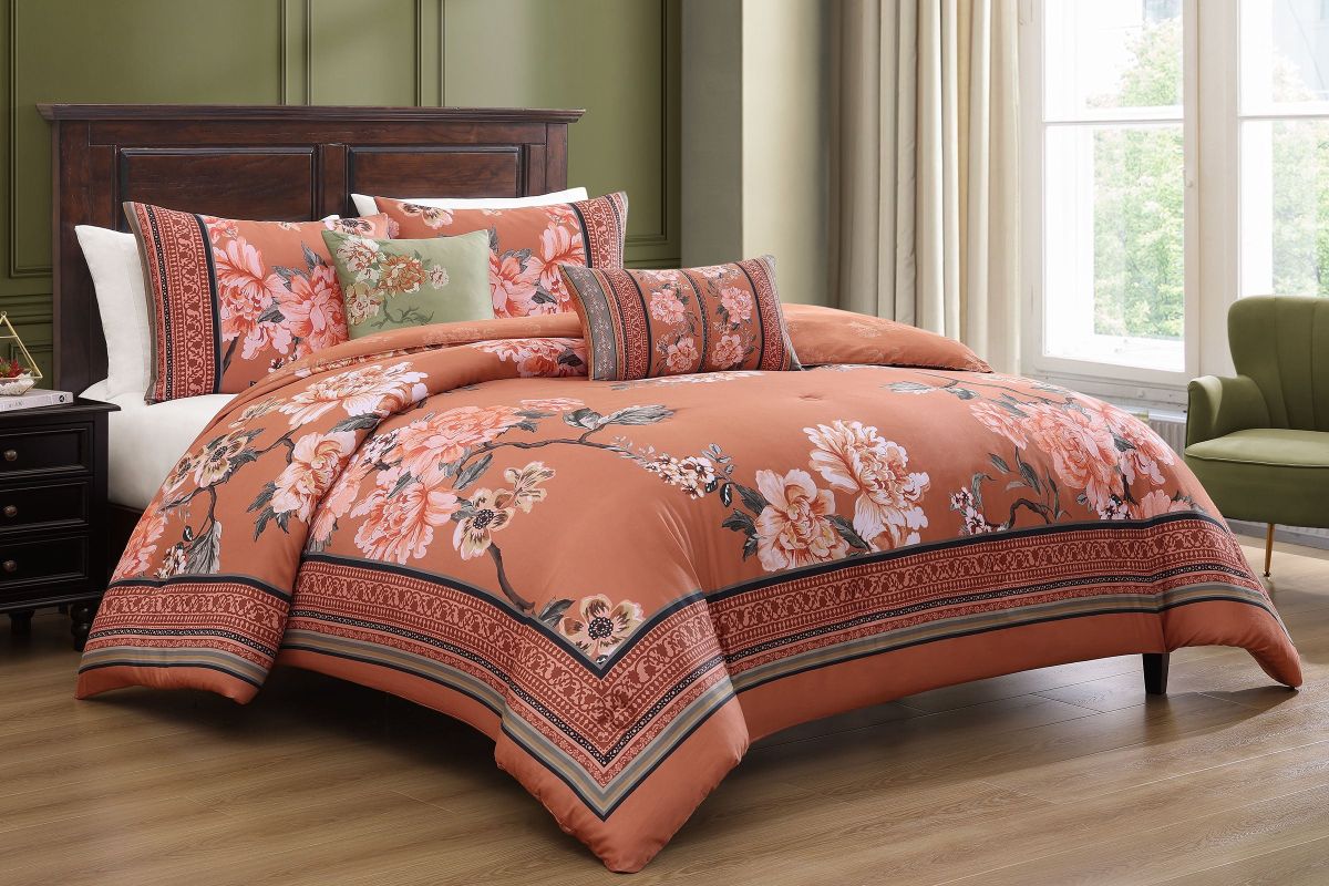 The terracotta, apricot and warm green tones of the Rossana 5 Piece Comforter Set bring a peace and serenity to this Asian inspired floral pattern. A unique and ornate border frames this print, emphasizing its beauty. The reverse side features soft, tonal flowers tossed randomly. To enhance the printed shams and comforter, there is one pillow with a stunning, fully embroidered group of flowers and a second printed pillow showing off the border design. The comfy 100% cotton sateen comforter set includes 2 shams, 1- 18" x 18" pillow and 1- 22" x 12" pillow. As a bonus, the set is packaged in a reusable self-fabric tote.