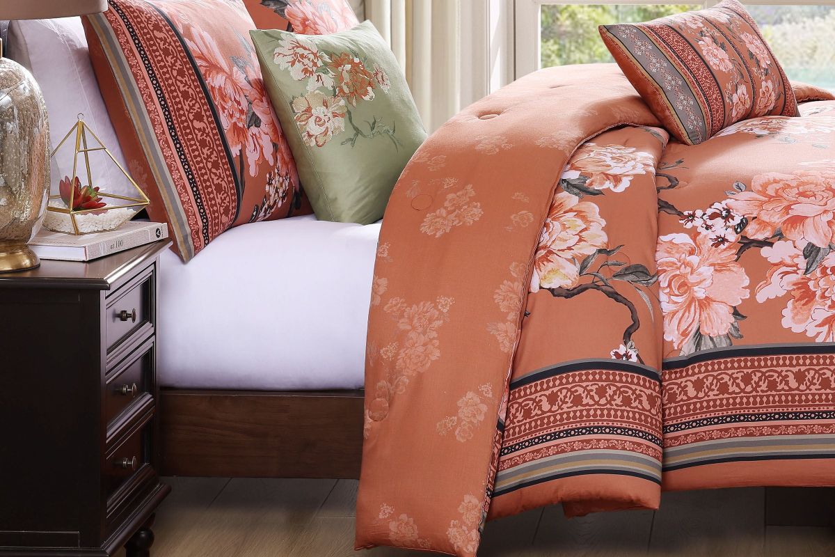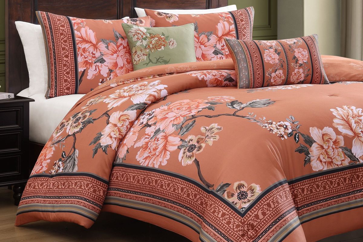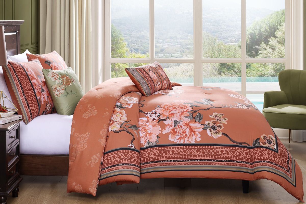 - Comforter Front- Asian inspired floral pattern in terracotta, apricot and warm green tones
