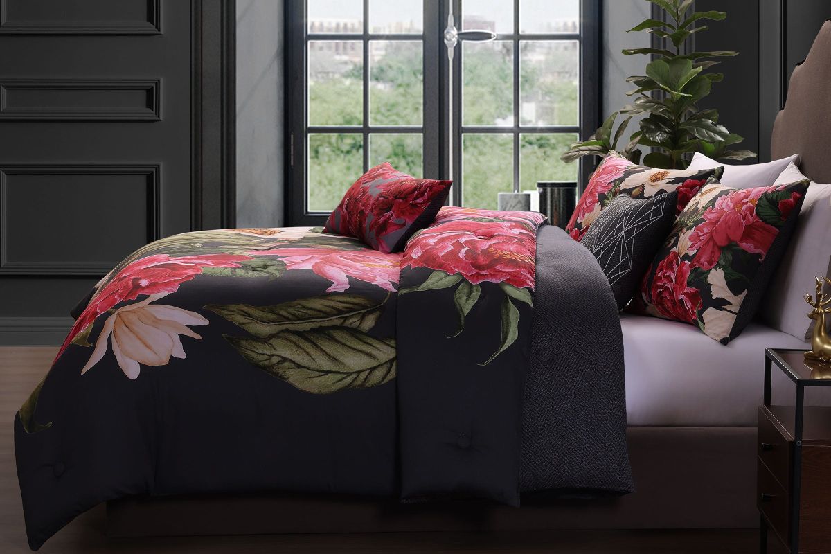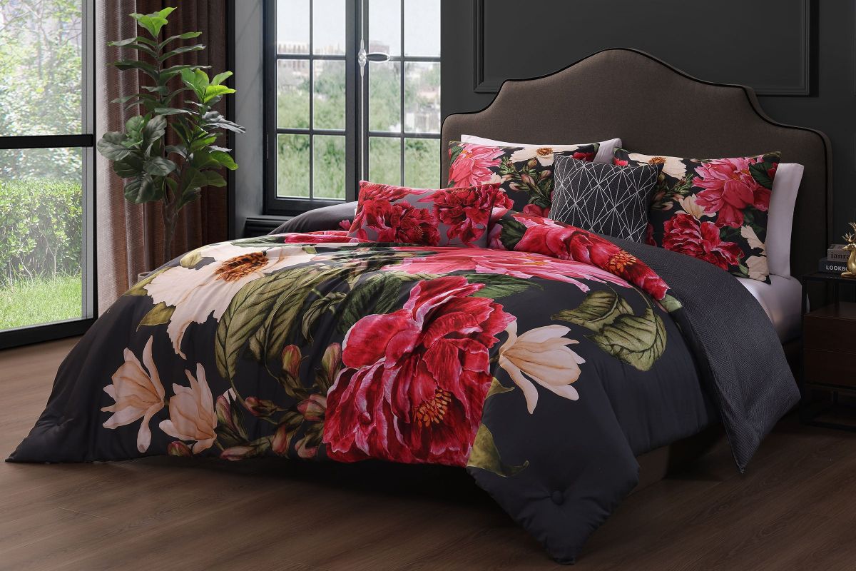 A lush garland of bright pink and ivory flowers looks stunning on a rich dark grey background in the Flower Garland 5 piece printed comforter set. The comfy 220 Thread Count 100% cotton sateen comforter set also includes 2 shams, 1- 18x18” embroidered pillow and 1- 22x12" printed pillow. This comforter also has great versatility as it reverses to a dark grey printed texture for a change of pace in your bedroom.