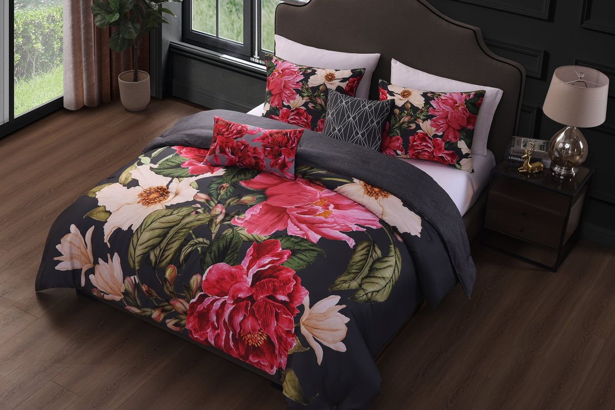- Comforter Front- lush garland of bright pink and ivory flowers looks stunning on a rich dark grey background