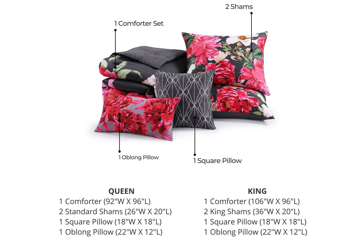 - Set Includes- 1 Comforter (106"W x 96"L), 2 King Shams (36"W x 20"L), 1 Embroidered Square Pillow (18"W x 18"L), 1 Printed Oblong Pillow (22"W x 12"L).