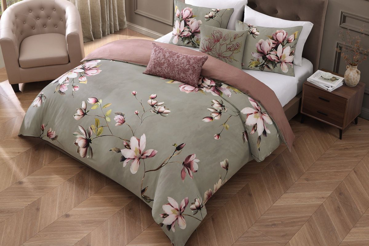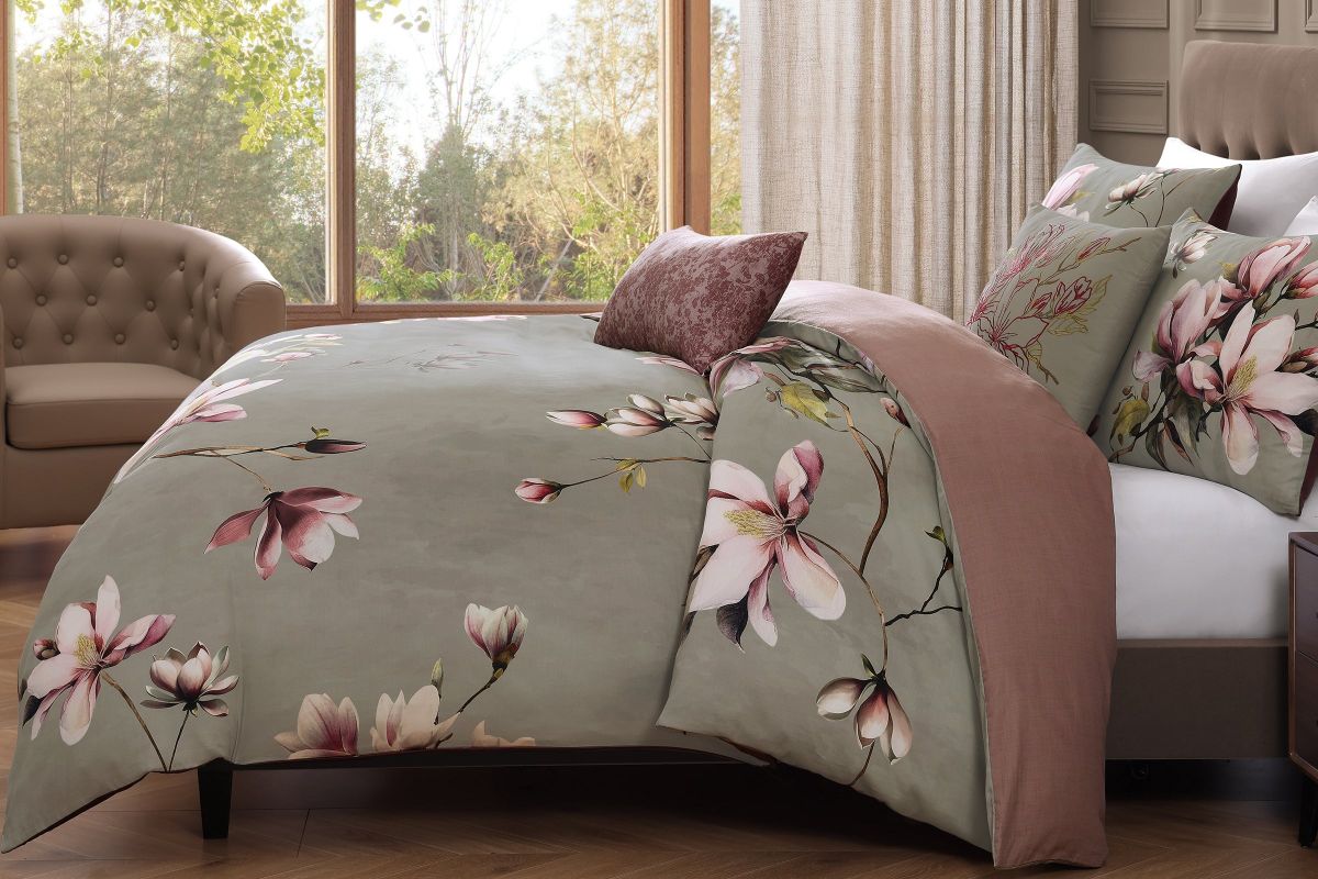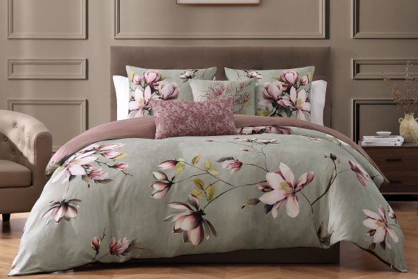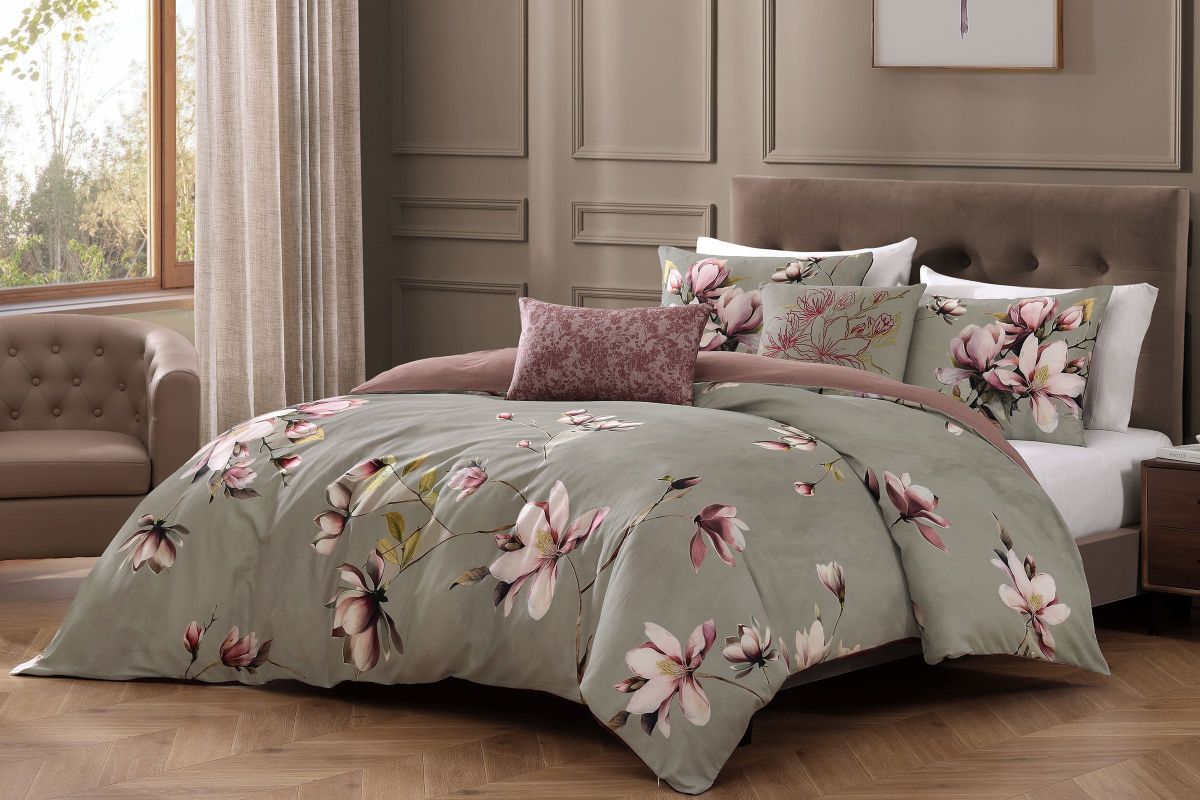 - Comforter Front- Branches of lovely orchid colored lilies are perched over a stormy silver green background